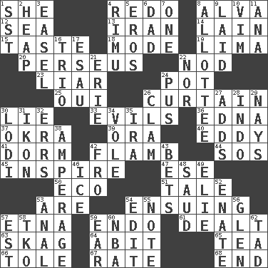 ACROSS 1. A female animal or person 4. Make new 8. Inventor's middle name 12. Ocean 13. SW Asia republic 14. (Had) reclined 15. Clothes sense 18. Method 19. Pale green bean 20. Son of Zeus who helped slay Medusa 22. Lower and raise head in agreement 23. One who doesn't tell the truth 24. Plant holder 25. Fr. "Yes" 26. Window treatment 30. Falsehood 33. Vices 36. Pulitzer Prize-winning author Ferber 37. Gumbo ingredient 39. Mouth or opening 40. Whirlpool 41. Dormintory (informal) 42. Flambe (short form) 44. Distress signal 45. Stimulate to action 47. Compass dir. 50. Environmental prefix 51. Lie 53. "We ___ not amused" (Victoria) 54. Taking place subsequently 57. Inactive volcano in Sicily 59. Inside; within (prefix) 61. Started a card game 63. Heroin 64. "This won't hurt ____!" 65. Beverage made from leaves 66. Lacquered or enameled metalware 67. Assign a rank or rating to 68. Conclusion DOWN 1. Fast jet (abbr.) 2. Pile 3. Artist's stand 4. Tall New Zealand timber tree 5. Greek god of love 6. Male parent 7. Single 8. One to whom something is allotted 9. Put down 10. Zeal 11. Santa ___, CA 16. Musical group of three 17. Son of Isaac 21. One of the Great Lakes 22. Not either 24. Product of festering 26. Burrowing marine mollusk 27. Does sums 28. Southeast Asian peninsula 29. Negative votes 30. Farming town in central California 31. Image 32. Blunders 34. Grand slam 35. Lyricist Gershwin 38. Electrical Measurement 42. Away 43. Wagers 46. Frozen water 48. Saudi Arabian king (1953-1964) 49. Writer Wiesel 52. Maternal 53. Of or related to the anus 54. Prepare for publication 55. Brief written record 56. Small, secluded valley 57. Eastern Standard Time (abbr.) 58. Ring climax 59. Ewer handle 60. Basketball assoc. 62. Small boy