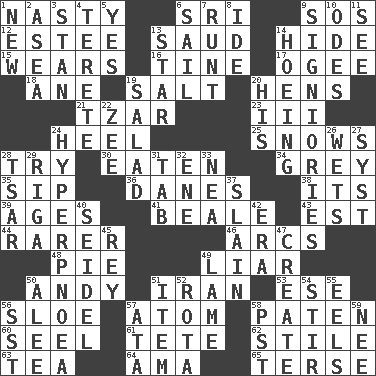 ACROSS 1. Thoroughly unpleasant 6. Indian title of respect (Mr.) 9. Distress signal 12. First name in cosmetics 13. Saudi Arabian king (1953-1964) 14. Flintstone garb 15. Erodes 16. Prong on a fork 17. Double curve, resembling the letter S 18. One (Scot) 19. Table seasoning 20. Coop moms 21. Czar 23. One more than two 24. The bottom of a shoe or boot 25. Frozen precipitation (plural) 28. Attempt 30. Consumed 34. Jennifer or Joel 35. Small drink 36. Natives or inhabitants of Denmark 38. ___ a Wonderful Life 39. Ripens 41. Memphis, Tenn. Street 43. Eastern Standard Time (abbr.) 44. More uncommon 46. Curves 48. Sliced dessert 49. One who doesn't tell the truth 50. Actor Griffith 51. SW Asia republic 53. Compass dir. 56. _ gin 57. Tiny particle 58. Eucharist need 60. Sew up the eyelids of hawks and falcons 61. False hair 62. Vertical member of a panel or frame 63. Beverage made from leaves 64. Nanny (var.) 65. Laconic DOWN 1. ___ Haven, CT 2. At sea 3. Comedian Laurel of Laurel & Hardy 4. Cylindrical with tapered ends 5. Consenting reply 6. Travel by water 7. Undersized animal 8. Binary compound 9. Seigniories (variant) 10. Lyric poems 11. Perceive with the eye 13. Play the lead 14. Weeding 19. First course 20. Part of HMS, perhaps 22. Last letter of the English alphabet 24. Abnormally rapid or deep breathing 26. Moistens 27. System (abbr.) 28. Russian ruler of old 29. Capital of Latvia 31. Bar bill 32. Compass dir. 33. Teachers' org. 37. Killed 40. A glass for beer 42. Period 45. Marina Del _, California 47. Make 49. Unable to walk 50. Toward shelter 51. A distinct part 52. Round or rotation of duties 54. Use a swizzle stick 55. Snakelike fish 56. Fast jet (abbr.) 57. "One Day ___ Time" 58. Pacific Standard Time (abbr.) 59. Born