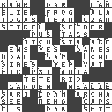 ACROSS 1. Sharp remark 5. Boat paddle 8. Experiment locale 11. Writer Wiesel 12. Toadlike animal 14. According to 15. Ancient Roman robes 17. Pull apart 18. Russian ruler of old 19. Beer mug 21. Sowing specialist 23. Product of festering 25. Labels 26. Hankering 27. R.R. building 28. Adept person 31. Followers of ems 33. Affirmative reply 35. Natives or inhabitants of Denmark 37. Allodial 38. Plant excrement 40. Old wives' tales, e.g. 41. Fathers 43. Slangy assent 45. Large container 46. And so on (abbr.) 47. Pacific Standard Time (abbr.) 50. Roberta Peters solo 52. False hair 53. To free from 54. Place where plants grow 56. Ear of corn 61. Indian skirt 62. Dutch treat 65. Odor 66. Perceive with the eye 67. San ____ (Riviera town) 68. Smile enhancers 69. Raised railways 70. Apply (a substance) by light strokes 71. Stricken, poetically DOWN 1. Wagers 2. _ vera 3. Swiss mountan, "Queen of the Mountains" 4. Necklace unit 5. Often (poetically) 6. "We ___ not amused" (Victoria) 7. Cooks with dry heat, as in an oven 8. Goldbrick 9. Having or resembling wings 10. Oblong piece of solid material 13. Relatively large 16. Back-to-school mo. 18. Music discs 20. "I Love _" 22. Mild oath 24. "______ My Girl" (Turtles hit) 26. Capri or Wight 28. Small Philippine buffalo 29. Certainty 30. Compass dir. 31. Prepare for publication 32. Drug cop 34. Declare 36. Inventor's middle name 37. Purpose 39. Lightbulb-shaped fruit 42. Hurried 44. Demure 48. Guide 49. Watched over 51. The main thing one is thinking about 52. Three (prefix) 54. Highlander 55. Ancient Greek god of war 57. Curves 58. Rich soil 59. Body of Kaffir warriors 60. 90 degrees 61. Compass dir. 63. Nursemaid (var.) 64. Crowd into