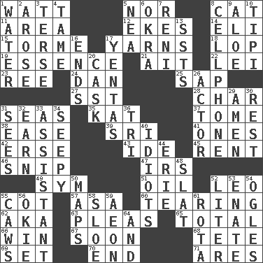 ACROSS 1. Electrical Unit 5. Not either 8. Domesticated feline 11. Length times width 12. Makes supply last 14. Connecticut Ivy Leaguer 15. Singer Mel 17. Entertaining tales 18. Trim (branches) 19. Substance 21. Small island 22. Flowery wreath 23. Portuguese money of account (variant) 24. Daniel's nick name 25. Plant excrement 27. Fast jet (abbr.) 28. Burn to charcoal 31. Oceans 35. Krazy ___ of comics 37. Heavy book 38. Relaxation 39. Indian title of respect (Mr.) 41. Washington bills 42. Celtic language 43. Binary compound 45. Monthly bill 46. Sever or remove by pinching or nipping 47. Big collection agency 49. Symbol (abbr.) 51. Petroleum 52. Lion 55. Small bed 57. White ___ sheet 60. Lacerating 62. Alias (abbr.) 63. Entreaties 65. "_____ Recall" 66. Victory 67. Within a short period 68. Wig 69. Put into a specified state 70. Conclude 71. Ancient Greek god of war DOWN 1. Wetness 2. Came up 3. Laconic 4. Not wild 5. Teachers' org. 6. Gumbo ingredient 7. Painter Guido (1575-1642) 8. Portable communications device 9. Medicinal plant 10. Native american tent (variation) 13. Fast planes 16. Conclusions 17. Gossips 20. Keg 26. Thespian 29. So be it 30. Take ten 31. Perceives with the eye 32. Merit 33. Aide 34. Not well drained, as in land 36. Three (prefix) 40. Foolish or stupid persons 44. One of the Great Lakes 48. Narrow board 50. Atlas contents 52. 61 cubic inches 53. Maternal 54. Stares 55. Crow sounds 56. Migrant worker of the '30s 58. _ gin 59. Period of immesurable duration 61. Roll call or roster of names 64. Plus