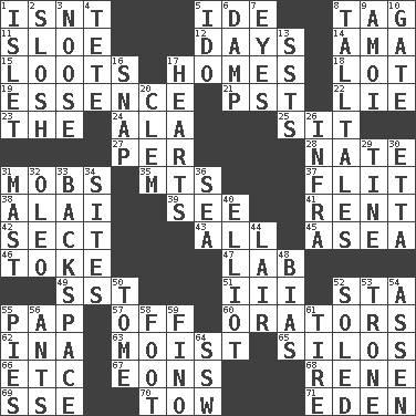 ACROSS 1. Is not 5. Binary compound 8. Label 11. _ gin 12. 24-hour periods 14. Nanny (var.) 15. Plunders 17. Dwellings 18. Car dealer's back yard 19. Core 21. Pacific Standard Time (abbr.) 22. Untruth 23. Definite Article 24. Chicken ___ king 25. Be seated 27. For each 28. Nathan's nickname 31. Disorderly crowds 35. Mountains (abbr.) 37. Secret move to avoid paying debts 38. Mountain range southwest of Kyrgyzstan 39. Observe 41. Monthly bill 42. Religious group 43. 100% 45. Toward the sea 46. Casino tip 47. Experiment locale 49. Fast jet (abbr.) 51. One more than two 52. R.R. building 55. Infant food 57. Below a satisfactory level 60. Speakers 62. _ tizzy (2 wds.) 63. Wet 65. Grain storage towers 66. And so on (abbr.) 67. Immeasurably long periods of time 68. French philosopher Descartes 69. Compass dir. 70. Pull behind 71. Paradise DOWN 1. Small island 2. Make a splashing sound 3. Trap for birds or small mammals 4. False hair 5. Wedding promise 6. Moist 7. Snake ____ (dice throw) 8. Baron Munchausen's specialties 9. Mine, in Marseilles 10. Yard entry 13. Fast planes 16. Fastener 17. Centers of feelings and intuitions 20. Clement's nick name 26. Kind of red light 29. Prong on a fork 30. Singer James 31. Vertical spar for supporting sails 32. Butter sub 33. Keyboard key 34. Locates 36. Ocean 40. American author Paul (1891-1958) 44. Den 48. Prejudice 50. Heavy book 52. Having a sole or soles 53. Heavy duty weighing machine 54. NE Netherlands city 55. Sliced desserts 56. Pismires 58. One third of a yard 59. A pale, very dry sherry 61. Hoop that covers a wheel 64. Compass dir.