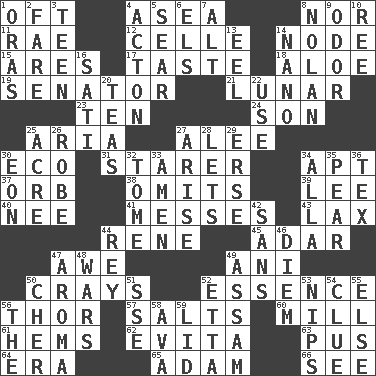 ACROSS 1. Often (poetically) 4. Toward the sea 8. And not 11. Actress Charlotte 12. Cell (Danish) 14. Connecting point 15. Ancient Greek god of war 17. Clothes sense 18. Medicinal plant 19. Elected representative 21. Type of eclipse 23. Nine, plus one 24. Male child 25. Operatic vocal solo 27. Toward shelter 30. Environmental prefix 31. A viewer who gazes fixedly 34. Fitting 37. Globe 38. Leaves out 39. Area sheltered from the wind 40. Born 41. Makes clutter 43. Not strict 44. French philosopher Descartes 45. The sixth month of the Jewish calendar 47. Deep reverence 49. Cuckoo 50. Trading vessels 52. Center 56. Son of Odin 57. Table seasonings 60. Place where flour is made 61. Cloth borders 62. Webber/Rice musical 63. Product of festering 64. Epoch 65. First of billions? 66. Perceive with the eye DOWN 1. Mouths or openings 2. Conductor's collection 3. Adolescent 4. NE Massachussets city 5. Scorch 6. Raised railways 7. The first octave above the treble staff 8. Pitcher Ryan 9. Aroma 10. To riddle 13. Snakelike fish 14. Billionth: prefix 16. Suttee (variant) 20. Beverages made from leaves 22. Purpose 25. 1/640 square mile 26. Loose flowing garment 27. Get up 28. Allows 29. Celtic language 30. Period of immesurable duration 32. Heavy book 33. So be it 34. Silent film actress Nazimova 35. Lightbulb-shaped fruit 36. John Ritter's dad 42. Without 44. Marina Del _, California 46. South Vietnam president (1954) 47. Odor 48. Armed conflicts 49. Indian state 50. "Mermaids" star 51. Compass dir. 52. Singer James 53. Pinches, bites 54. A slight indication 55. Otherwise 56. Definite Article 58. Actress Gardner 59. Hat (slang)
