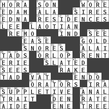 ACROSS 1. Israeli folk dance 5. Male child 8. Had on 12. Dutch treat 13. Insect wing 14. Founders of families 15. Pulitzer Prize-winning author Ferber 16. Dwellings 19. Area sheltered from the wind 20. Of or relating to Laos or its people 21. San ____ (Riviera town) 23. Indiana (abbr.) 24. Perceive with the eye 27. Comfort 30. Precious metal 31. Sounds asleep 34. Jai ____ 35. Small amounts or degrees 38. Fourth or lowest deck 40. Monthly bill 41. 4th largest of the Great Lakes 42. Scheduled 44. Observes 45. Libertine 46. Small boy 47. Large container 50. Inside; within (prefix) 53. Speakers 57. Lyricist Gershwin 59. Supplying deficiencies 63. Of or related to the anus 64. Distinguishing feature 65. Lair 66. Assign a rank or rating to 67. Helper 68. Compass dir. 69. Family _ (genealogy) DOWN 1. The bottom of a shoe or boot 2. More peculiar 3. The wife of a rajah (variant) 4. Nursemaid (var.) 5. "Two Mules for Sister ____" 6. Margarine 7. Political cartoonist Thomas 8. Victory 9. The grampus (Milton) 10. To separate or throw off 11. Double-curved letter 14. Transmit 17. One more than two 18. Daniel's nick name 20. Grant temporary use of 22. Makes clutter 24. Flatfish 25. Enthusiasm 26. Prepare for publication 28. "Barney Miller" actor Jack 29. Blunders 30. Place where plants grow 32. Pipe bend 33. Fly high 35. Trial 36. Type of rug 37. Passed on 39. Parent Teacher Association (abbr.) 43. Makes supply last 47. Electrical Unit 48. "We ___ not amused" (Victoria) 49. Make lace 51. Middle Eastern gold or silver currency 52. Speak pompously 54. Periodic rise and fall of the sea level 55. Baking chamber 56. French philosopher Descartes 58. Toward shelter 59. R.R. building 60. RI univ. 61. Writing tablet 62. Sliced dessert 63. Tate display