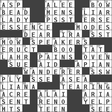 ACROSS 1. Cleo's killer 4. Toward shelter 8. Ribbon knot 11. Necklace unit 13. Not women's 14. One who doesn't tell the truth 15. Kenny Rogers chart-topper in '80 16. Inconspicuous attention getter 17. Celtic language 18. Core 21. Methods 22. Letter starter 23. Lyricist Gershwin 25. Fast jet (abbr.) 26. Cut the grass 29. Orators 32. Spew [out] 34. Sometimes accompanies a hiss 35. Make lace 38. Cowardly lion portrayer 39. Aches 41. Baking chamber 43. Institute legal proceedings 44. Assist 45. Bee-related 46. Nomad 50. Compass dir. 51. Travel a route regularly 54. Compass dir. 55. At sea 57. Climbing, woody, usually tropical vines 59. Pulling apart 63. 1/640 square mile 64. Mountain range southwest of Kyrgyzstan 67. Operatic vocal solo 68. Transmitted 69. Western Nevada city 70. Sharp bark 71. Mountains (abbr.) 72. Adolescent 73. Observe DOWN 1. Competent 2. Oceans 3. Groovy apts. 4. Electrical Unit 5. French article 6. Followers of ems 7. Eastern Standard Time (abbr.) 8. Avian creatures 9. Fertile tracts in a desert 10. Obtain by seizing forcibly or violently 12. Colored 14. Lion 19. Egg locale 20. Head covering 21. Make imperfect 23. Picture 24. Vintage cars 26. Cartoonist voice _ Blanc 27. Mouths or openings 28. Chinese city south-southwest of Nanjing 30. Tolerate 31. Halt 33. Group working together 36. Deliberation 37. Afternoon social gatherings 39. Baking dishes 40. Helper 42. Compass dir. 45. Type of rug 47. White ___ sheet 48. Food allowance for one day 49. Compass dir. 51. Suffix with ecto or cyto 52. It is permitted: Lat. 53. Entertaining tales 56. Like ___ of sunshine 58. Fish or hair follower 60. Angers 61. Mediterranean tributary 62. Open wide 64. Tate display 65. Area sheltered from the wind 66. One (Scot)