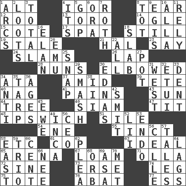 ACROSS 1. The first octave above the treble staff 4. Composer Stravinsky 8. Separate forcefully 12. Friend of Pooh 13. "Corrida" creature 14. Stare 15. ____ d'Azur (French Riviera) 17. Petty quarrel 18. Free from disturbance or agitation 19. Showing deterioration from age 21. Actor Linden 23. Declare 24. Hits or strikes with great force 26. Infant locale 28. Religious women 30. Turned at an angle; bent 34. "One Day ___ Time" 37. Among 39. Wig 40. Tired old horse 41. Aches 43. Player for Phoenix 44. Family _ (genealogy) 46. Thailand, formerly 47. Teat (slang) 48. NE Massachusetts town 51. Drop; flow; fall 54. Compass dir. 55. Colored lightly or faintly 58. And so on (abbr.) 61. Police officer (slang) 63. Perfect 65. Sports stadium 67. Rich soil 71. Water jar 72. Trig term 73. Celtic language 74. Part of a journey 75. Haul 76. Blind as ____ 77. Double-curved letter DOWN 1. Curves 2. Plunders 3. "_____ Recall" 4. It is 5. Republican Party 6. Mouth or opening 7. Writer of Portnoy's Complaint (1969) 8. Small child 9. The front part of a cuirass 10. Silent film actress Nazimova 11. Depend 16. Flair 18. Broad, flat, thick piece 20. Australian flightless bird 22. 100% 25. Fastener 27. Cooking vessel 29. Box-office sellout 30. Ferber et al. 31. Compass direction 32. Needle holder 33. Gouge 34. Against 35. Canvas cover 36. Eras 38. One more than two 42. Stricken, poetically 45. She-sheep 49. South American Indian 50. Corporate head (abbr.) 52. Cards in a Roman deck? 53. Inside; within (prefix) 56. Cell (Danish) 57. Stories 58. Compass direction 59. Musical group of three 60. Penny 62. Entreaty 64. Falls behind 66. Born 68. Globe 69. White ___ sheet 70. Was introduced to