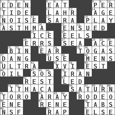 ACROSS 1. Paradise 5. Ingest 8. For each 11. Event that recurs at intervals 12. Cowardly lion portrayer 14. Ripen 15. Annoying sound 17. "Two Mules for Sister ____" 18. Shaw product 19. Respiratory problem 21. Took place subsequently 23. Frozen water 25. Snakelike fish 26. Blunders 27. Ocean 28. Adept person 31. Storage container 33. Hearing organ 35. Ancient Roman robes 37. Mild oath, euphamism for damn 38. Purpose 40. Not women's 41. Extreme 43. 16 45. Eastern Standard Time (abbr.) 46. Petroleum 47. Mayday 50. SW Asia republic 52. Respite 53. Directed 54. New York city 56. Titan orbits this 61. "Corrida" creature 62. Like ___ of sunshine 65. Cowboy competition 66. Compass dir. 67. French philosopher Descartes 68. Bar bills 69. Overdraft (abbr.) 70. Reproach for some lapse or misdeed 71. Otherwise DOWN 1. Inactive volcano in Sicily 2. "Vaya con ____" 3. Prepare for publication 4. Tender 5. Raised railways 6. American Automobile Association (abbr.) 7. Triads 8. Light colored 9. Mild oath 10. Marina Del _, California 13. Indian princess (variant) 16. Arab leader 18. Fluid product of inflammation 20. Measure of real estate 22. Narrow board 24. Son of Isaac 26. Engineer (abbr.) 28. Matures 29. Patter 30. Double-curved letter 31. Indonesian resort city 32. International (abbr.) 34. Acura sports coupe 36. Sign of things to come 37. Superhero pair 39. Morally bad or wrong 42. At sea 44. Angers 48. Witty Wilde 49. A viewer who gazes fixedly 51. The sixth month of the Jewish calendar 52. 17th letter of the Greek alphabet 54. Charged atoms 55. Unclean, religiously 57. Carryall 58. Freehold land 59. Confederate soldiers (slang) 60. Characteristic smell of wine 61. Nine, plus one 63. Santa ___, CA 64. Slangy assent