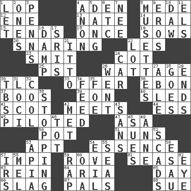ACROSS 1. Chop off 4. An important port of Yemen 8. Ancient Persian 12. Compass dir. 13. Nathan's nickname 14. Mountain range 15. Is inclined (to) 18. At one time in the past 19. Sty mamas 20. Catching in a trap 22. French article 23. Stricken, poetically 24. Small bed 25. Pacific Standard Time (abbr.) 26. Electrical Measurement 30. Affectionate concern, for short 33. Auction bid 36. Inky black, to poets 37. Expressions of contempt or scorn 39. A really long time 40. Downhill vehicle 41. Native of Scotland 42. Confronts 44. Curvy letter 45. Manned the helm 47. White ___ sheet 50. Cooking vessel 51. Religious women 53. Fitting 54. Core 57. Body of Kaffir warriors 59. Be footloose 61. Gospel singer Marvin 63. It's straight from the horse's mouth 64. Roberta Peters solo 65. 24 hours 66. Volcanic refuse 67. Friends 68. Institute legal proceedings DOWN 1. Allow 2. Washington bills 3. Actor Sean's family 4. Soon (poet.) 5. Mild oath, euphamism for damn 6. And so on (abbr.) 7. Born 8. French bagpipes 9. Greek god of love 10. Obsolete 11. Raised railways 16. Moist 17. Indian titles of respect 21. "Tell ____ the Marines!" 22. Car dealer's back yard 24. Automobile 26. Gone 27. Competent 28. Moves 29. Extremities 30. Cook's measure (abbr.) 31. Venues 32. Calm and collected 34. Nourish 35. Enemy 38. Discontinuing 42. Was introduced to 43. Without 46. Small child 48. Takes to court 49. Singer Murray 52. Oodles 53. Capital of Western Samoa 54. Tending to cause great harm 55. Oceans 56. He sold his birthright 57. Big collection agency 58. Cartoonist voice _ Blanc 59. Strike 60. Mouth or opening 62. Sight organ