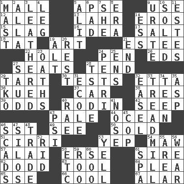 ACROSS 1. Shopping center 5. Domed church section 9. Purpose 12. Toward shelter 13. Cowardly lion portrayer 14. Greek god of love 15. Volcanic refuse 16. The main thing one is thinking about 17. Table seasoning 18. Make lace 19. Tate display 21. First name in cosmetics 22. Hollow 24. Fenced enclosure 26. Begley and Asner 27. Theater features 28. Be inclined (to) 29. Small pie 30. Trials 32. Singer James 36. Malaysian steamed pastry 37. Auto 38. Ancient Greek god of war 39. Probability 40. "The Thinker" sculptor 42. Ooze 43. Diluted with white 44. Sea 46. Fast jet (abbr.) 49. Observe 50. Exchanged or delivered for money 51. High-altitude cloud 53. Slangy assent 54. Informal term for the mouth 57. Jai ____ 58. Celtic language 61. The founder of a family 62. Texas town _ City 63. Instrument 64. Entreaty 65. Compass dir. 66. Calm and collected 67. Having or resembling wings DOWN 1. Vertical spar for supporting sails 2. Silent film actress Nazimova 3. Tough but pliablecoriaceous 4. Part of a journey 5. Came down and settled, as after flight 6. Writing tablet 7. A female animal or person 8. Epoch 9. A salt of uric acid 10. Having a sole or soles 11. _____ Park, CO 14. Double-curved letter 19. The first octave above the treble staff 20. Take ten 21. Conclude 23. Curses 24. _ dish (used to culture cells) 25. Followers of ems 27. Saudi Arabian king (1953-1964) 28. Sadhe (variant) 29. Ring climax 31. Learning spot: Fr. 32. Artist's stand 33. Excercise machine 34. Adolescent 35. Cleo's killer 40. Actress Charlotte 41. Sense of smell 43. Air pressure measure (abbr.) 45. Police officer (slang) 46. Oodles 47. Grain storage towers 48. Exchange 52. To free from 53. Shout 55. Length times width 56. Erode 58. And so on (abbr.) 59. Friend of Pooh 60. "Barney Miller" actor Jack 61. Health resort