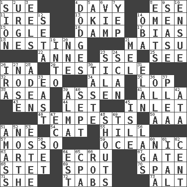 ACROSS 1. Take to court 4. American folk hero Crockett 8. Compass dir. 11. Angers 13. Migrant worker of the '30s 14. Sign of things to come 15. Stare at amorously 16. Moist 17. Prejudice 18. Snuggling 21. Taiwanese island in East China Sea 22. Singer Murray 23. Compass dir. 25. Observe 26. _ tizzy (2 wds.) 29. A testis 32. Cowboy competition 34. Wing 35. Trim (branches) 38. At sea 39. NE Netherlands city 41. Silent film actress Nazimova 43. Followers of ems 44. Allow 45. An arm off of a larger body of water 46. Storms 50. American Automobile Association (abbr.) 51. One (Scot) 54. Domesticated feline 55. Land elevation 57. With motion or animation 59. Pertaining to the sea 63. Johnson of "Laugh-In" 64. Shade of tan 67. Yard entry 68. Proofreading order 69. Specific locale 70. Connect, as a bridge 71. A female animal or person 72. Bar bills 73. The first octave above the treble staff DOWN 1. The Jewish people; Israel 2. Goad 3. Snakelike fish 4. Evades 5. Alias (abbr.) 6. Zeal 7. Slangy assent 8. Sends forth 9. Gospel singer Marvin 10. Follow as a consequence or result 12. Stalk of a moss capsule 14. Chief or king in Benin or Nigeria 19. To the inside or interior of 20. Compass dir. 21. Cartoonist voice _ Blanc 23. Drop; flow; fall 24. Skim 26. Lyricist Gershwin 27. Sense of smell 28. Arabian gulf 30. Clothes sense 31. Enthusiasm 33. 90 degrees 36. Water jar 37. Entreaty 39. _ mater 40. Back-to-school mo. 42. _ moment's notice (2 wds.) 45. Capri or Wight 47. Environmental prefix 48. Yells 49. Nervous spasm 51. Collect or gather 52. _ pole 53. First name in cosmetics 56. Fails to keep up a pace 58. Arrange properly for use 60. California wine valley 61. Slanted text style (abbr.) 62. Penny 64. Eastern Standard Time (abbr.) 65. Numbers guy (abbr.) 66. Director Reiner