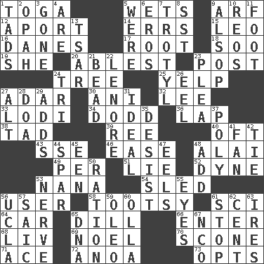 ACROSS 1. Ancient Roman robe 5. Soaks 9. Sandy's bark 12. To the left, to Queeg 14. Blunders 15. Lion 16. Natives or inhabitants of Denmark 17. Carrot, for example 18. "Barney Miller" actor Jack 19. A female animal or person 20. Most capable 23. Mail 24. Relationship diagram 25. Sharp bark 27. The sixth month of the Jewish calendar 30. Black tropical American cuckoo 32. Area sheltered from the wind 33. Farming town in central California 34. Texas town _ City 36. Infant locale 38. Bit 39. To separate or throw off 40. Often (poetically) 43. Compass dir. 46. Relaxation 48. Mountain range southwest of Kyrgyzstan 49. For each 51. Falsehood 52. Unit of force 53. Nanny 54. Downhill vehicle 56. One who makes use of a thing 58. A girl or young woman (variant) 61. _-fi 64. 4-wheeled motor vehicle 65. Deli pickle 66. Keyboard key 68. 54 in ancient Rome 69. Christmas carol 70. Biscuitlike quick bread 71. Adept person 72. Small Philippine buffalo 73. Elects DOWN 1. Small boys 2. Brightly colored fish 3. Went 4. "We ___ not amused" (Victoria) 5. Past tense of be (plural) 6. Greek god of love 7. TNT 8. Fast jet (abbr.) 9. Columnist Joseph or Stewart 10. Vintage cars 11. One third of a yard 13. Russian ruler of old 21. Necklace unit 22. Poe poem 23. Entreaty 24. Three (prefix) 26. Snakelike fish 27. The first octave above the treble staff 28. ___ good deed 29. Sums up 31. Perfect 35. Cease 37. Much (prefix) 41. Avid follower 42. Standoff 44. Practice fight 45. Car or cant ending 47. Snakelike fish 48. Increase 50. Food allowance for one day 53. Effrontery 55. Sight organs 56. Southern CA. univ. 57. Ketch in the Levant 59. Margarine 60. Spanish pot 61. Discontinue 62. Penny 63. Angers 65. Heredity factor (abbr.) 67. Non-commissioned officer (abbr.)