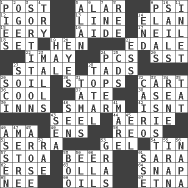 ACROSS 1. Mail 5. Having or resembling wings 9. 23rd letter of the Greek alphabet 12. Composer Stravinsky 13. Actor's bit 14. Liveliness 15. Suggestive of the supernatural 16. Assistant 17. Famous astronaut Armstrong 18. Arrange properly for use 19. Layer 21. Peak District village in England 22. "If ____ say so..." 24. Personal Computers (abbr.) 26. Fast jet (abbr.) 27. Having lost freshness 28. Bits 29. The visible part of the earth's surface 30. Closes up, plugs up 32. Haul 36. Calm and collected 37. Had dinner 38. At sea 39. Taverns 40. Excessive but superficial compliments 42. Is not 43. Sew up the eyelids of hawks and falcons 44. Nest on high 46. Nursemaid (var.) 49. Followers of ems 50. Vintage cars 51. Father Junipero _ 53. Set 54. Metal container 57. Portico 58. Fermented drink made from hops 61. "Two Mules for Sister ____" 62. Celtic language 63. Water jar 64. Fastener 65. Born 66. Petroleums 67. Inactive volcano in Sicily DOWN 1. Sliced desserts 2. Double curve, resembling the letter S 3. Decision 4. Attempt 5. Actor Alda or Thicke 6. Cards in a Roman deck? 7. Also 8. Portuguese money of account (variant) 9. Entreaties 10. Moves on water 11. An arm off of a larger body of water 14. Conclusion 19. Actor Linden 20. Snake ____ (dice throw) 21. Double-curved letter 23. Promenades 24. Some stationery 25. Music discs 27. Within a short period 28. "_____ Recall" 29. _-fi 31. Softens 32. Capital of Egypt 33. Helper 34. French philosopher Descartes 35. Make lace 40. Elected rep. 41. Female horse 43. Ocean 45. Snakelike fish 46. NE Netherlands city 47. Distance measurement (Brit.) 48. Came up 52. Actress Charlotte 53. Pate de foie ____ 55. SW Asia republic 56. California wine valley 58. Oct. 31 cry 59. Biblical high priest 60. Pipe bend 61. Compass dir.