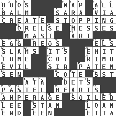 ACROSS 1. Scornful sounds 5. Atlas unit 8. Everything 11. Lip ointment 12. "Two Mules for Sister ____" 13. By way of 14. Cause to be 17. Obstructing or blocking passage 19. Threatening words 21. Makes clutter 22. Vertical spar for supporting sails 23. Nonscientific branch of learning 24. Oval reproductive body of a fowl 27. Vintage cars 29. Raised railways 32. Criticizes harshly 34. ___ a Wonderful Life 36. Give off 37. Heavy book 38. Small bed 39. Tall New Zealand timber tree 40. Morally bad or wrong 41. Title for a knight 42. Eucharist need 43. Elected rep. 44. ____ d'Azur (French Riviera) 46. Fast jet (abbr.) 47. _ moment's notice (2 wds.) 50. Stakes 52. Soft color 55. Centers 57. Electrical Measurement 59. Dirtied 62. Area sheltered from the wind 63. Comedian Laurel of Laurel & Hardy 64. Grant temporary use of 65. Conclude 66. Car or cant ending 67. Singer James DOWN 1. English channel? 2. Rowing implement 3. Margarine 4. Excessive but superficial compliments 5. Floor covering 6. Odor 7. Some stationery 8. Advice 9. Actor's bit 10. Fails to keep up a pace 12. Compass dir. 15. Rends 16. Otherwise 18. Pacific Standard Time (abbr.) 20. Unemotional ones 24. _____ Park, CO 25. Michael Jackson trademark 26. Street urchin 28. Unemotional 29. Sends forth 30. Citrus fruits 31. Check the growth or development of 33. Cartoonist voice _ Blanc 35. Disco prop 36. Period 42. Stone: prefix 45. Beverages made from leaves 47. Had dinner 48. Laconic 49. Having winglike extensions 51. Vertical member of a panel or frame 52. Diluted with white 53. So be it 54. Drove too fast 55. Layer 56. Narrow, elongated depression 58. Separate the seeds from cotton 60. Consume 61. Heredity factor (abbr.)