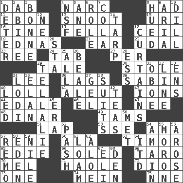ACROSS 1. Apply (a substance) by light strokes 4. Drug cop 8. Possessed 11. Inky black, to poets 13. Snout, nose 15. RI univ. 16. Prong on a fork 17. Man or boy (slang) 18. To provide with a ceiling 19. Ferber et al. 21. Hearing organ 22. Hereditary estate 23. Portuguese money of account (variant) 24. Bar bill 27. For each 29. Lie 30. Took without asking 34. Area sheltered from the wind 36. Fails to keep up a pace 39. Unit of acoustic absorption 40. Hang loosely or laxly 41. Native American of Southwest Alaska 43. Charged particles 44. Peak District village in England 46. Writer Wiesel 47. Born 48. Middle Eastern gold or silver currency 49. Scottish caps 51. Infant locale 53. Compass dir. 54. Nursemaid (var.) 57. Painter Guido (1575-1642) 60. In the manner of 63. The easternmost of the Lesser Sundas 65. Singer Brickell 66. Having a sole or soles 69. Edible starchy tuberous root 70. Cartoonist voice _ Blanc 71. White Person, in Hawaii 72. "Vaya con ____" 73. Single 74. Chow _ 75. Compass dir. DOWN 1. Prevent from occurring 2. Tolerate 3. Child's nurse 4. Overdraft (abbr.) 5. One (Scot) 6. Hero or heavy, e.g. 7. Root beer relative 8. Became colored 9. Operatic vocal solo 10. Deli pickle 12. Teachers' org. 14. Canvas cover 18. Window treatments 20. R.R. building 25. Silent film actress Nazimova 26. Calif. Air Force Base 28. Double-curved letter 29. Copy Pinocchio 31. Mitch Miller's instrument 32. Actor's bit 33. Followers of ems 34. Farming town in central California 35. Liveliness 37. Set 38. Sets or collections 40. Directed 42. Beverages made from leaves 45. Period 50. Was introduced to 52. Romantic infatuation 54. At full speed 55. Person of subnormal intelligence 56. Came up 57. San ____ (Riviera town) 58. Paradise 59. "Death on the ____" 61. Rich soil 62. Medicinal plant 64. It would 67. Biblical high priest 68. Lair