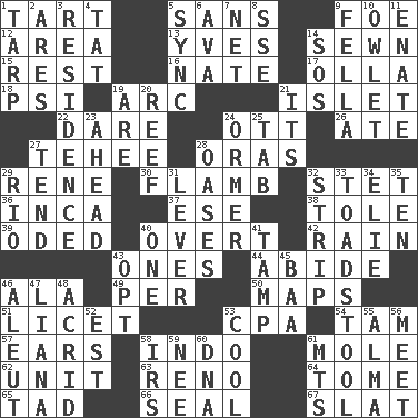 ACROSS 1. Small pie 5. Without 9. Enemy 12. Type of rug 13. Jacques Cousteau's middle name 14. Stitched 15. Take ten 16. Nathan's nickname 17. Water jar 18. 23rd letter of the Greek alphabet 19. Curve 21. Small island 22. Have the gumption 24. Baseball player Mel 26. Had dinner 27. Giggle 28. Mouths or openings 29. French philosopher Descartes 30. Flambe (short form) 32. Proofreading order 36. South American Indian 37. Compass dir. 38. Lacquered or enameled metalware 39. Wrote a lyric poem 40. Unconcealed 42. Precipitation 43. Singles 44. Stay 46. Insect wing 49. For each 50. Atlas contents 51. It is permitted: Lat. 53. Tax preparer (abbr.) 54. Scottish cap 57. Hearing organs 58. Southeast Asian peninsula 61. Undercover agent 62. A single undivided whole 63. Western Nevada city 64. Heavy book 65. Bit 66. Lick closed 67. Narrow board DOWN 1. Canvas cover 2. Ancient Greek god of war 3. Home 4. Make lace 5. Synchronize (abbr.) 6. Actress Gardner 7. Fish or hair follower 8. Compass dir. 9. Chap (slang) 10. A small or young owl 11. Related on the mother's side 14. Distress signal 19. "We ___ not amused" (Victoria) 20. Coral ridge 21. ___ a Wonderful Life 23. Having the leading position 24. Channel Islands abalone 25. Keyboard key 27. Watch over 28. Fertile tracts in a desert 29. _ de Janeiro 31. Crowbar 32. Remove all contents or possession from 33. Inedible or poisonous agaric 34. Writer Wiesel 35. Nine, plus one 40. Single 41. Pack (down) 43. Elect 45. Sound made by sheep 46. Native American of Southwest Alaska 47. Climbing, woody, usually tropical vines 48. Bitter 52. Eastern Standard Time (abbr.) 53. Calm and collected 55. _ mater 56. Confront 58. Big collection agency 59. Born 60. Heredity factor (abbr.) 61. Mountains (abbr.)