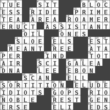 ACROSS 1. Third day of the wk. 4. Be seated 7. Alliance 11. Curvy letter 12. Travel on an animal 13. First class 14. Afternoon social gathering 15. Length times width 16. Nomad 17. Spew [out] 19. Helper 21. Petroleum 23. Singles 24. A type of plum 25. Raised railways 26. Eastern Standard Time (abbr.) 29. Intended 30. To riddle 31. "One Day ___ Time" 32. For each 33. Working for oneself (abbr.) 34. Small child 35. Atmosphere 36. _-fi 37. An organ shaped like a helmet 40. Heredity factor (abbr.) 41. Area sheltered from the wind 42. Inky black, to poets 43. Examine hastily 45. Pipe bend 46. Making a chance decision by using lots 51. Dodge 55. Foolish or stupid persons 56. Republicans 58. _ de Janeiro 59. Impressive in appearance 60. Respite 61. Commissioned military rank (abbr.) 62. Celtic language 63. Biblical high priest 64. Begley and Asner DOWN 1. Wig 2. One who uses or employs something 3. Son of Isaac 4. Title for a knight 5. The content of cognition 6. Beverages made from leaves 7. Naughty children 8. Pale green bean 9. Sign of something about to happen 10. An absolute certainty 12. Food allowance for one day 13. Introduce or present, as a question 16. Remove soap 18. Root beer relative 20. Having a sole or soles 22. Allow 24. Father Junipero _ 25. Bert's buddy 26. Eroded 27. Portico 28. Make lace 29. Chow _ 32. Groovy apt. 33. Ancient Celtic tribe of eastern Britain 36. Narrow boards 37. Unit of force equal to gravity 38. Most capable 39. Hang loosely or laxly 43. Took without asking 44. Quote 46. Trig term 47. Scent 48. Chest bones 49. Legendary monster 50. Christmas carol 52. Goad 53. Passed on 54. Immeasurably long periods of time 57. 23rd letter of the Greek alphabet