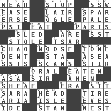 ACROSS 1. Put on (as clothing) 5. Cease 9. Compass dir. 12. Relaxation 13. Den 14. Practice fight 15. Celtic language 16. Stare 17. Diluted with white 18. Air pressure measure (abbr.) 19. Ingest 21. Actors' quests 22. Downhill vehicle 24. "We ___ not amused" (Victoria) 26. Fast jet (abbr.) 27. Fur scarf 28. Russian ruler of old 29. US Secretary of Labor Elaine L. _ 30. Trap for birds or small mammals 32. Heavy book 36. Undesirable depression on a surface 37. R.R. building 38. Toward the sea 39. Fast planes 40. Fraudulent business schemes 42. Commotion 43. Spoken 44. Consumed 46. White ___ sheet 49. Title for a knight 50. So be it 51. To gather and bind into a bundle 53. Epoch 54. Be seated 57. "Two Mules for Sister ____" 58. Froth on beer 61. Become fatigued 62. Roberta Peters solo 63. Capri or Wight 64. Nights before holidays 65. Binary compound 66. Comedian Laurel of Laurel & Hardy 67. A home for chicks DOWN 1. Shed a tear 2. Hearing organs 3. Aide 4. Portuguese money of account (variant) 5. Groove 6. Label 7. Petroleum 8. Before (prefix) 9. Practice fights 10. Table seasonings 11. Obtain by seizing forcibly or violently 14. Health resort 19. Snakelike fish 20. Arabian gulf 21. For each 23. Plunders 24. Indian state 25. Actress Charlotte 27. "______ My Girl" (Turtles hit) 28. "_____ Recall" 29. Music discs 31. Witty Wilde 32. Clothes sense 33. Clearly or manifestly demonstrative 34. Count _ (2 wds.) 35. Hearing organ 40. Indian title of respect (Mr.) 41. Singe 43. Order of Saint Francis (abbr.) 45. Nanny (var.) 46. Slender Brazilian palm 47. Pottery fragment 48. Nest on high 52. Auto club (abbr.) 53. Paradise 55. Angers 56. Trial 58. Part of HMS, perhaps 59. Eastern Standard Time (abbr.) 60. Wing 61. "___ Little Indians"