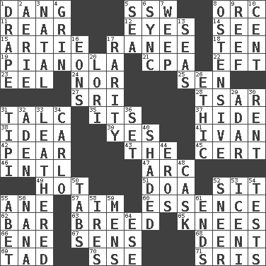 ACROSS 1. Mild oath, euphamism for damn 5. Compass dir. 8. The grampus (Milton) 11. Posterior 12. Sight organs 14. Perceive with the eye 15. Nick name for Arthur 17. The wife of a rajah (variant) 18. Nine, plus one 19. Player piano 21. Tax preparer (abbr.) 22. Bank Draft (abbr.) 23. Snakelike fish 24. Not either 25. Elected rep. 27. _ Lanka 28. Russian ruler of old 31. Baby powder 35. ___ a Wonderful Life 37. Flintstone garb 38. The main thing one is thinking about 39. Affirmative reply 41. "Terrible" tsar 42. Lightbulb-shaped fruit 43. Definite Article 45. Sure thing 46. International (abbr.) 47. Curve 49. Being at a high temperature 51. ___ good deed 52. Be seated 55. A saturated hydrocarbon 57. Direct toward a target or goal 60. Substance 62. Soap unit 63. A special lineage 65. Leg joints 66. Compass dir. 67. Elected reps. 68. Gouge 69. Bit 70. Compass dir. 71. Indian titles of respect DOWN 1. Window treatment 2. Nest on high 3. Brizilian seaport 4. Broad smile 5. Ocean 6. Synchronize (abbr.) 7. Shed a tear 8. Clearly or manifestly demonstrative 9. Coral collection 10. Penny 13. Oceans 16. Immeasurably long periods of time 17. Noteworthy scarcity 20. Australian parrot (variant) 26. Principle of right and wrong 29. The sixth month of the Jewish calendar 30. Monthly bill 31. Native american tent (variation) 32. Arabian gulf 33. Resembling or made to resemble leather 34. Monte _, Las Vegas Hotel/Casino 36. Arrange properly for use 40. Cast a shadow over 44. Greek god of love 48. Keg 50. Bar bills 52. Contemptuous expression 53. Ancient Celtic tribe of eastern Britain 54. Trials 55. Collude with 56. Grandmother 58. Angers 59. Not women's 61. Conclusions 64. Compass dir.