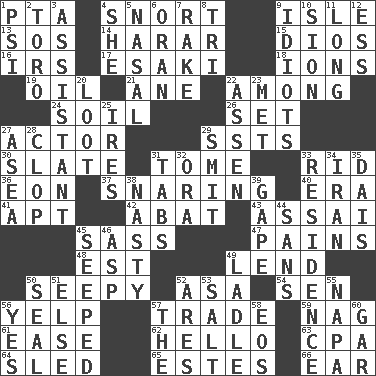 ACROSS 1. Parent Teacher Association (abbr.) 4. Derisive sound 9. Small island 13. Mayday 14. Ethiopian city, capital of Harari 15. "Vaya con ____" 16. Big collection agency 17. 1973 Nobel Price Winner (Physics) Leo 18. Charged atoms 19. Lubricate 21. A saturated hydrocarbon 22. Amid 24. Land 26. Put into a specified state 27. Thespian 29. Fast planes 30. Schedule 31. Heavy book 33. To free from 36. Period of immesurable duration 37. Catching in a trap 40. Period 41. Fitting 42. Blind as ____ 43. Slender Brazilian palm 45. Backtalk 47. Aches 48. Eastern Standard Time (abbr.) 49. Grant temporary use of 50. Not well drained, as in land 52. White ___ sheet 54. Elected rep. 56. Sharp bark 57. Barter 59. Tired old horse 61. Relaxation 62. Phone greeting 63. Accounting whiz (abbr.) 64. Downhill vehicle 65. _____ Park, CO 66. Ewer handle DOWN 1. Air pressure measure (abbr.) 2. "Corrida" creature 3. Aide 4. A female animal or person 5. Rhinal 6. Northwest Algerian city 7. Libertine 8. Three (prefix) 9. Foolish or stupid persons 10. The Jewish people; Israel 11. Protracted 12. Double-curved letter 20. Plunder 22. NE Netherlands city 23. Was introduced to 25. Angers 27. Toward the sea 28. Hoof sound 29. Stricken, poetically 31. Bar bills 32. Mouth or opening 33. Dwelling 34. SW Asia republic 35. Raised platform 38. Characterized by obscenity 39. Stare wonderingly 44. Without 45. Oozed 46. Cleo's killer 49. Dipping utensil 50. Lick closed 51. Otherwise 52. Ancient Greek god of war 53. Table seasoning 55. California wine valley 56. Affirmative reply 57. Definite Article 58. Greek goddess of the dawn 60. Slender fish