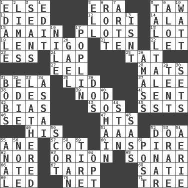 ACROSS 1. Otherwise 5. Epoch 8. The 23rd letter of the Hebrew alphabet 11. Passed on 12. Australian parrot (variant) 14. Chicken ___ king 15. With great haste 17. Small pieces of grounds 18. Car dealer's back yard 19. Small, flat, pigmented spot on the skin 21. Nine, plus one 22. Allow 23. Curvy letter 24. Pet locale 25. Make lace 27. Snakelike fish 28. Floor coverings 31. Actor Lugosi 35. Hat (slang) 37. Toward shelter 38. Lyric poems 39. Dreamland 41. Posted 42. Prejudice 43. Distress signal 45. Fast planes 46. Bristle 47. Mountains (abbr.) 49. Part of HMS, perhaps 51. Auto club (abbr.) 52. ___ good deed 55. A saturated hydrocarbon 57. Small bed 60. Stimulate to action 62. And not 63. Constellation of myth 65. Echolocation 66. Had dinner 67. Canvas cover 68. Suttee (variant) 69. Directed 70. Fish or hair follower 71. Relationship diagram DOWN 1. Peak District village in England 2. Citrus fruits 3. Actors Connery and Penn 4. Prepare for publication 5. Pipe bend 6. Carrot, for example 7. Johnson of "Laugh-In" 8. Baron Munchausen's specialties 9. Medicinal plant 10. Electrical Unit 13. Is not 16. The longest river in the world 17. Cotton for raincoats, e.g. 20. Highlander 26. Collect or gather 29. Portable shelter 30. Puts into a specified state 31. Moves up and down 32. Singer Brickell 33. Tough but pliablecoriaceous 34. Slender Brazilian palm 36. Two (Sp.) 40. Realm 44. Comedian Laurel of Laurel & Hardy 48. Backtalk 50. Highlander 52. Middle Eastern gold or silver currency 53. Speak pompously 54. Nest on high 55. Of or related to the anus 56. Brief written record 58. Northwest Algerian city 59. Become fatigued 61. Mail 64. Choose