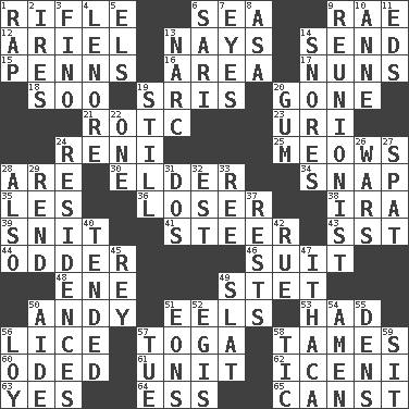 ACROSS 1. Ransack; plunder; pillage 6. Ocean 9. Actress Charlotte 12. Satellite of Uranus 13. Negative votes 14. Transmit 15. Actor Sean's family 16. Type of rug 17. Religious women 18. "Barney Miller" actor Jack 19. Indian titles of respect 20. Went 21. College mil. group 23. RI univ. 24. Painter Guido (1575-1642) 25. Catcalls? 28. "We ___ not amused" (Victoria) 30. A person who is older than you are 34. Fastener 35. French article 36. Failure 38. Lyricist Gershwin 39. In a ____ (agitated or irritated) 41. Guide 43. Fast jet (abbr.) 44. More peculiar 46. Set or collection 48. Compass dir. 49. Proofreading order 50. Actor Griffith 51. Snakelike fish 53. Possessed 56. Louse (plural) 57. Ancient Roman robe 58. Softens 60. Wrote a lyric poem 61. A single undivided whole 62. Ancient Celtic tribe of eastern Britain 63. Consenting reply 64. Curvy letter 65. 2nd pers. sing. pres. of can (arch.) DOWN 1. Hit sharply and swiftly 2. Angers 3. A pale, very dry sherry 4. Poe poem 5. Raised railways 6. Indian skirt 7. Sight organs 8. White ___ sheet 9. One who advocates reunion 10. Singer Murray 11. Begley and Asner 13. Drug cop 14. Sounds asleep 19. Free of sound 20. Chewing product 22. Single 24. Homes 26. Armed conflicts 27. Petty quarrel 28. In addition 29. Tear apart 31. Two (Sp.) 32. Eastern Standard Time (abbr.) 33. To riddle 37. Musical pauses 40. Looked after 42. Sorrow 45. Marina Del _, California 47. New York city 49. Narrow board 50. Assistant 51. Immeasurably long periods of time 52. The front part of a cuirass 54. So be it 55. Habitations of wild animals 56. Myrna of the movies 57. Third day of the wk. 58. Nervous spasm 59. Be seated