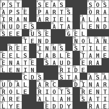 ACROSS 1. Pacific Standard Time (abbr.) 4. Oceans 8. Mayday 11. Domed church section 13. Pieces 15. Mouth or opening 16. SW Asia republic 17. Satellite of Uranus 18. Jai _ 19. Unadorned figures 21. "One Day ___ Time" 22. Grant temporary use of 23. Perceive with the eye 24. Purpose 27. Set 29. Look after 30. Pitcher Ryan 34. Portuguese money of account (variant) 36. Restaurants 39. Vertical member of a panel or frame 40. Snakelike fish 41. Eating place 43. Not wild 44. Maternal 46. Saudi Arabian king (1953-1964) 47. Period 48. Soviet premier 1918-24 49. Travel on an animal 51. Music discs 53. R.R. building 54. White ___ sheet 57. Allodial 60. Curve 63. Middle Eastern gold or silver currency 65. Hero or heavy, e.g. 66. Disturbances 69. Monthly bill 70. "We ___ not amused" (Victoria) 71. Assad's deity 72. Suttee (variant) 73. Potassium hydroxide 74. Whirlpool 75. Actress Charlotte DOWN 1. Aches 2. Disorder 3. Sadhe (variant) 4. Health resort 5. Hearing organ 6. Operatic vocal solo 7. Proofreading order 8. Flatfish 9. NW Algerian seaport 10. Expressed in words 12. Compass dir. 14. Volcanic refuse 18. One to whom something is allotted 20. Institute legal proceedings 25. In a ____ (agitated or irritated) 26. Ferber et al. 28. Followers of ems 29. One of the two male reproductive glands 31. One who doesn't tell the truth 32. _ mater 33. Born 34. French philosopher Descartes 35. Style 37. Basketball assoc. 38. Disparaging remarks 40. Snakelike fish 42. Prepare for publication 45. Conclusion 50. June honoree 52. "Two Mules for Sister ____" 54. Approach 55. Before Barbara or Clara 56. Nick name for Arthur 57. Mountain range 58. Rowboat 59. Toward shelter 61. Cause heat under the collar 62. Having a low temperature 64. Big collection agency 67. Small boy 68. Like a shrinking violet