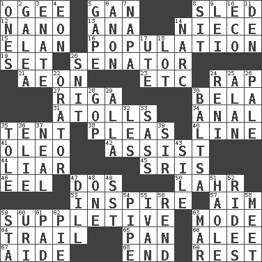 ACROSS 1. Double curve, resembling the letter S 5. Separate the seeds from cotton 8. Downhill vehicle 12. Billionth: prefix 13. Santa ___, CA 14. Sibling's daughter 15. Enthusiasm 16. Census information 19. Put into a specified state 20. Legislator 21. A really long time 23. And so on (abbr.) 24. Hit sharply and swiftly 27. Port city in Latvia 30. Actor Lugosi 31. Ringlike coral islands and reefs 34. Of or related to the anus 35. Portable shelter 38. Entreaties 40. Actor's bit 41. Butter sub 42. Help 44. One who doesn't tell the truth 45. Indian titles of respect 46. Snakelike fish 47. Two (Sp.) 50. Cowardly lion portrayer 53. Heighten or intensify 57. Direct toward a target or goal 59. Supplementary 63. Method 64. Hang back 65. Baking dish 66. Toward shelter 67. Assistant 68. Conclude 69. State of inaction DOWN 1. Singles 2. An organ shaped like a helmet 3. Maternal 4. Period of immesurable duration 5. Yawn 6. At once, immediately (arch.) 7. California wine valley 8. Be seated 9. Luau accessory 10. Environmental prefix 11. Lair 14. Drug cop 17. Shoshoni 18. Car dealer's back yard 20. In a ____ (agitated or irritated) 22. Speaker 24. Painter Guido (1575-1642) 25. Actor Alda or Thicke 26. Light colored 28. Grand Old Party 29. Silent film actress Nazimova 30. Greek mezzo-soprano Agnes 32. French article 33. Backtalk 35. Lacquered or enameled metalware 36. Writer Wiesel 37. Be tempered by heat 39. Title for a knight 43. Filth; sediment 47. Deli pickle 48. Single 49. Fast jet (abbr.) 51. White Person, in Hawaii 52. Amusement-park features 54. Corncob 55. _ the terrible 56. Tear apart 58. Rendezvous 59. R.R. building 60. RI univ. 61. Groovy apt. 62. Sliced dessert 63. Spoil