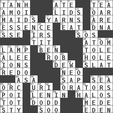 ACROSS 1. Hyperbolic tangent 5. Had dinner 8. Afternoon social gathering 11. Mine, in Marseilles 12. Hats (slang) 14. Rowing implement 15. Unmarried girls 17. Tall tales 18. "We ___ not amused" (Victoria) 19. Core 21. Ingest 22. Heredity factor (abbr.) 23. Compass dir. 24. Big collection agency 25. Mayday 27. Teat (slang) 28. Tiny particle 31. Desk light 35. Benjamin's nick name 37. Lacquered or enameled metalware 38. Toward shelter 39. Director Reiner 41. Opening into or through something 42. Charged particles 43. Morning condensation 45. Narrow board 46. Make new 47. Modern: prefix 49. White ___ sheet 51. Plant excrement 52. Ocean 55. The grampus (Milton) 57. RI univ. 60. Speakers 62. Luau course 63. Soviet premier 1918-24 65. Auras 66. Small child 67. Texas town _ City 68. Ancient Persian 69. Filthy place 70. "Barney Miller" actor Jack 71. Genesis locale DOWN 1. Softens 2. Collect or gather 3. Annoying sound 4. Flintstone garb 5. According to 6. Become fatigued 7. Pulitzer Prize-winning author Ferber 8. Inedible or poisonous agaric 9. Merit 10. Length times width 13. Fast planes 16. In a ____ (agitated or irritated) 17. Last past 20. Baby bed with high sides 26. Expletives 29. Rounded earthenware pot or jar 30. Confront 31. Den 32. Medicinal plant 33. Ananias' fault 34. Mexican monetary units 36. Dreamland 40. Gillaume's butler role 44. Put on (as clothing) 48. Brightly colored fish 50. Old (Scot.) 52. Having a sole or soles 53. Eat (away) 54. NE Netherlands city 55. Chooses 56. Carrot, for example 58. Vintage cars 59. _ china 61. Not wild 64. Wedding promise