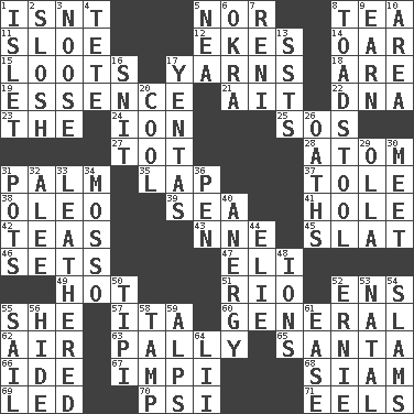 ACROSS 1. Is not 5. And not 8. Afternoon social gathering 11. A type of plum 12. Supplements with great effort 14. Boat paddle 15. Plunders 17. Tall tales 18. "We ___ not amused" (Victoria) 19. Center 21. Small island 22. Heredity factor (abbr.) 23. Definite Article 24. Electrically charged atom 25. Distress signal 27. Small child 28. Smallest unit of an element 31. Inside of hand 35. Pet locale 37. Lacquered or enameled metalware 38. Butter sub 39. Ocean 41. Opening into or through something 42. Afternoon social gatherings 43. Compass dir. 45. Narrow board 46. Puts into a specified state 47. Connecticut Ivy Leaguer 49. Being at a high temperature 51. _ de Janeiro 52. Followers of ems 55. A female animal or person 57. Call ___ day 60. Commissioned military rank 62. Wind 63. Chummy 65. Before Barbara or Clara 66. Binary compound 67. Body of Kaffir warriors 68. Thailand, formerly 69. Directed 70. Air pressure measure (abbr.) 71. Snakelike fish DOWN 1. Small island 2. Agitate, as a liquid 3. Trap for birds or small mammals 4. False hair 5. Teachers' org. 6. Gumbo ingredient 7. Painter Guido (1575-1642) 8. Inedible or poisonous agaric 9. Merit 10. Type of rug 13. Fast planes 16. In a ____ (agitated or irritated) 17. Gossips 20. Calm and collected 26. Profane or obscene expressions 29. Spanish pot 30. Rendezvous 31. Plant holders 32. Toward shelter 33. Resembling or made to resemble leather 34. With motion or animation 36. Fenced enclosure 40. Disorder of the immune system 44. Writer Wiesel 48. Charged atoms 50. Native american tent (variation) 52. Bert's buddy 53. Brizilian seaport 54. Criticizes harshly 55. Travel by water 56. Flintstone garb 58. Pack (down) 59. High mountains 61. Comfort 64. Cards in a Roman deck?