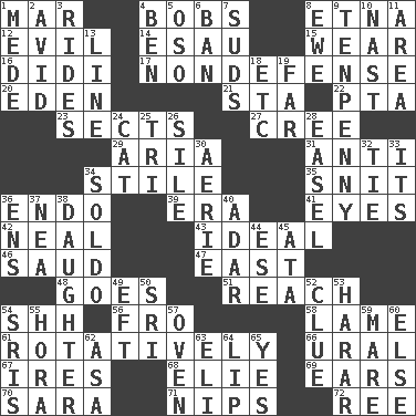 ACROSS 1. Spoil 4. Moves up and down 8. Inactive volcano in Sicily 12. Tending to cause great harm 14. He sold his birthright 15. Erode 16. "You Light Up My Life" star Conn 17. Unrelated to defense, as in spending 20. Locale of original sin 21. R.R. building 22. Parent Teacher Assoc. 23. Religious groups 27. Algonquian 29. Operatic vocal solo 31. Against 34. Vertical member of a panel or frame 35. In a ____ (agitated or irritated) 36. Inside; within (prefix) 39. Period 41. Snake ____ (dice throw) 42. Be tempered by heat 43. Perfect 46. Saudi Arabian king (1953-1964) 47. 90 degrees 48. Moves 51. Arrive at 54. Quiet! 56. Back 58. Unable to walk 61. Producing rotation 66. Mountain range 67. Angers 68. Writer Wiesel 69. Hearing organs 70. "Two Mules for Sister ____" 71. Cuts off 72. To sift DOWN 1. Ancient Persian 2. Enthusiastic 3. Amusement-park features 4. Benjamin's nick name 5. Bear (Spanish) 6. Prohibit 7. Soap bubbles 8. She-sheep 9. 3-inch nail 10. Political cartoonist Thomas 11. Length times width 13. Actor's bit 18. And so on (abbr.) 19. At a great distance 24. Feline 25. Three (prefix) 26. Filth; sediment 28. Artist's stand 30. Nest on high 32. Neckwear 33. ___ a Wonderful Life 34. Twentieth part of a lira 36. Followers of ems 37. Teachers' org. 38. Female offspring 40. The sixth month of the Jewish calendar 44. Compass dir. 45. "One Day ___ Time" 49. Bank Draft (abbr.) 50. Indian title of respect (Mr.) 52. A slight indication 53. Ethiopian city, capital of Harari 54. Indian titles of respect 55. Israeli folk dance 57. Baking chamber 59. Female horse 60. Otherwise 62. White ___ sheet 63. Connecticut Ivy Leaguer 64. Mouth edge 65. Affirmative reply