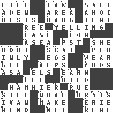 ACROSS 1. Do some clerical work 5. The 23rd letter of the Hebrew alphabet 8. Table seasoning 12. An important port of Yemen 13. Type of rug 15. Mine, in Marseilles 16. Musical pauses 18. Sharp remark 19. Portable shelter 20. To separate or throw off 22. Crying or shouting loudly 24. Relaxation 26. A really long time 27. At sea 28. Pacific Standard Time (abbr.) 29. A female animal or person 32. Carrot, for example 35. Jazz singing style 37. For each 38. In an inward manner 39. Greek goddess of the dawn 40. Erode 41. Set 42. High mountains 43. Sums up 44. White ___ sheet 45. Raised railways 46. Merit 49. Pipe bend 50. Passed on 51. More given to overacting 55. Sorrow 56. Drop; flow; fall 57. Allodial 59. Naughty children 63. "Terrible" tsar 64. Create 65. 4th largest of the Great Lakes 66. Tear apart 67. Was introduced to 68. French philosopher Descartes DOWN 1. At a great distance 2. Binary compound 3. French article 4. Plea 5. Keyboard key 6. Like ___ of sunshine 7. We are 8. Smooth fabric 9. So be it 10. Yearn 11. Teat (slang) 14. Most capable 17. Oceans 21. Compass dir. 23. Car dealer's back yard 25. Artist's stands 28. Went by 29. Broke a traffic law 30. Froth on beer 31. Blunders 32. Capital of Latvia 33. Singles 34. Spanish pot 36. Police officer (slang) 40. Roamer 42. Plant genus of onion and garlic 45. Shade tree 47. Atmosphere 48. Reuben's nickname 49. Make improvements or corrections to 51. Hub of activity 52. Actor Alda or Thicke 53. Dutch treat 54. Immoral or dissolute person 56. Title for a knight 58. Allow 60. "We ___ not amused" (Victoria) 61. Metal container 62. Observe