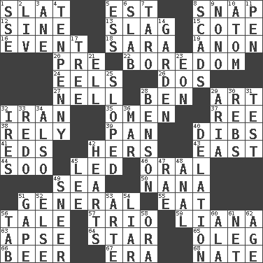 ACROSS 1. Narrow board 5. Eastern Standard Time (abbr.) 8. Fastener 12. Trig term 13. Volcanic refuse 15. ____ d'Azur (French Riviera) 16. Incident 18. "Two Mules for Sister ____" 19. At once, immediately (arch.) 20. Before (prefix) 22. Mood resulting from idleness 24. Snakelike fish 26. Two (Sp.) 27. 1994 drama film starring Jodie Foster 28. Benjamin's nick name 29. Tate display 32. SW Asia republic 35. Sign of things to come 37. To separate or throw off 38. Have trust in 39. Baking dish 40. Claim 41. Begley and Asner 42. Possessive pronoun 43. 90 degrees 44. "Barney Miller" actor Jack 45. Directed 46. Spoken 49. Ocean 50. Nanny 51. Commissioned military rank 55. Ingest 56. Falsehood 57. Musical group of three 59. Woody, climbing, usually tropical plant 63. Domed church section 64. Play the lead 65. Cassini of fashion 66. Fermented drink made from hops 67. Period 68. Nathan's nickname DOWN 1. Compass dir. 2. 54 in ancient Rome 3. A saturated hydrocarbon 4. 3-inch nail 5. Double-curved letter 6. Thick slice 7. Edible starchy tuberous root 8. Tons 9. Words to Nanette 10. Smallest unit of an element 11. Fenced enclosure 14. Place where plants grow 17. Family _ (genealogy) 21. Pipe bend 23. Period of immesurable duration 25. Had an oblique or slanted direction 28. Gillaume's butler role 29. Operatic vocal solo 30. Confederate soldiers (slang) 31. Trial 32. Angers 33. Redecorate 34. In addition 36. Spoil 40. Conveyance 42. Centers 45. Area sheltered from the wind 47. Actress Charlotte 48. Of or related to the anus 49. Contemptuous expression 51. Stare wonderingly 52. Otherwise 53. Johnson of "Laugh-In" 54. One who doesn't tell the truth 56. Bar bill 58. Mouth or opening 60. Wing 61. Fish or hair follower 62. Personal question