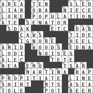 ACROSS 1. Type of rug 5. Nine, plus one 8. Downhill vehicle 12. One who doesn't tell the truth 13. Chief or king in Benin or Nigeria 14. Sibling's daughter 15. Old wives' tales, e.g. 16. Census information 19. Had dinner 20. Elected representative 21. Neighbor of Neb. 23. And so on (abbr.) 24. Pat or tap gently 27. Crow sounds 30. Event that recurs at intervals 31. Dismiss 34. Person who is morally reprehensible 35. Among 38. Forest 40. Pulitzer Prize-winning author Ferber 41. Farming town in central California 42. Annoying sounds 44. Actor Baldwin 45. Wig 46. Teachers' org. 47. Australian flightless bird 50. Russian ruler of old 53. Chrissie's court nemesis 57. Reproach for some lapse or misdeed 59. Appease 63. Actor's bit 64. Upper-body garment 65. Mountains (abbr.) 66. At sea 67. Lacquered or enameled metalware 68. Plant holder 69. Fermented drink made from hops DOWN 1. Silent film actress Nazimova 2. Disturbances 3. Having ears or earlike features 4. "We ___ not amused" (Victoria) 5. Drink excessively 6. Inky black, to poets 7. California wine valley 8. Be seated 9. Luau accessory 10. Environmental prefix 11. Lair 14. Drug cop 17. Shoshoni 18. Car dealer's back yard 20. Heroin 22. Being or containing an acid 24. Passed on 25. Arabian gulf 26. Actor Lugosi 28. Compass dir. 29. Within a short period 30. College papers 32. Friend of Pooh 33. Prepare for publication 35. Actor Alda or Thicke 36. Undercover agent 37. The content of cognition 39. Compass dir. 43. Singer James 47. Give off 48. Floor protector 49. RI univ. 51. Ascend 52. Indian princess (variant) 54. Pack (down) 55. "Tell ____ the Marines!" 56. Egg locale 58. Lightbulb-shaped fruit 59. Pacific Standard Time (abbr.) 60. 17th letter of the Greek alphabet 61. Lubricate 62. Before (prefix) 63. Experiment locale
