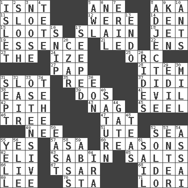 ACROSS 1. Is not 5. A saturated hydrocarbon 8. Alias (abbr.) 11. _ gin 12. We are 14. Lair 15. Plunders 17. Killed 18. Passenger plane 19. Center 21. Directed 22. Followers of ems 23. Definite Article 24. Ending with capital 25. The grampus (Milton) 27. Infant food 28. A whole individual unit 31. Groove 35. To riddle 37. "You Light Up My Life" star Conn 38. Comfort 39. Two (Sp.) 41. Tending to cause great harm 42. Essential or central part 43. Tired old horse 45. Sew up the eyelids of hawks and falcons 46. Relationship diagram 47. Make lace 49. Born 51. Shoshoni 52. Ocean 55. Affirmative reply 57. White ___ sheet 60. Thinks logically 62. Biblical high priest 63. Unit of acoustic absorption 65. Table seasonings 66. 54 in ancient Rome 67. Russian ruler of old 68. The content of cognition 69. Area sheltered from the wind 70. R.R. building 71. Australian parrot (variant) DOWN 1. Small island 2. Splash clumsily 3. Trap for birds or small mammals 4. False hair 5. Leather borer 6. Anneal 7. 4th largest of the Great Lakes 8. Descriptive word 9. Peachy ____! 10. Pismires 13. Inside; within (prefix) 16. Sever or remove by pinching or nipping 17. Oozed 20. Russian ruler of old 26. Amusement-park features 29. Singer Brickell 30. Place where flour is made 31. Back-to-school mo. 32. Den 33. Clearly or manifestly demonstrative 34. Giggle 36. A really long time 40. Titan orbits this 44. Yard entry 48. Beverages made from leaves 50. Compass direction 52. Twentieth part of a lira 53. Keyboard key 54. Slender Brazilian palm 55. Shout 56. Writer Wiesel 58. Backtalk 59. Blind as ____ 61. Move on water 64. Lyricist Gershwin