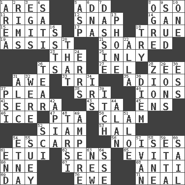 ACROSS 1. Ancient Greek god of war 5. Increase 8. Bear (Spanish) 11. Port city in Latvia 12. Fastener 14. Separate the seeds from cotton 15. Gives off 17. Romantic infatuation 18. Loyal 19. Aid 21. Flew 23. Definite Article 25. In an inward manner 26. Russian ruler of old 27. Snakelike fish 28. Last letter of the English alphabet 31. Deep reverence 33. Three (prefix) 35. Goodbye (Sp.) 37. Entreaty 38. _ Lanka 40. Charged particles 41. Father Junipero _ 43. R.R. building 45. Followers of ems 46. Frozen water 47. Parent Teacher Association (abbr.) 50. Dollar (slang) 52. Thailand, formerly 53. Actor Linden 54. Fortification 56. Annoying sounds 61. Needle case 62. Elected reps. 65. Webber/Rice musical 66. Compass dir. 67. Angers 68. Against 69. 24 hours 70. She-sheep 71. Anneal DOWN 1. Length times width 2. Basketball hoops 3. The front part of a cuirass 4. Suttee (variant) 5. Cleo's killer 6. Heredity factor (abbr.) 7. Hyrax 8. Legendary monster 9. Saudi Arabian king (1953-1964) 10. Single 13. Give a jingle 16. Fast planes 18. Attempt to accomplish something 20. Not this but _ 22. Silent film actress Nazimova 24. Blunders 26. Pull apart 28. The Jewish people; Israel 29. Immeasurably long periods of time 30. Curvy letter 31. Actor Baldwin 32. Past tense of be (plural) 34. Big collection agency 36. South Vietnam president (1954) 37. 23rd letter of the Greek alphabet 39. Hankering 42. Capital of Western Samoa 44. Actor Alda or Thicke 48. Tarsus (plural) 49. Electrical Unit 51. Medicinal plant 52. _-fi 54. Inactive volcano in Sicily 55. Chop _ 57. _ the terrible 58. Trig term 59. Singer James 60. Travel by water 61. Conclusion 63. ___ Haven, CT 64. Compass dir.