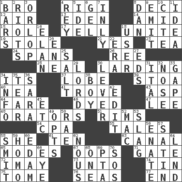 ACROSS 1. Sis' sibling 4. Swiss mountan, "Queen of the Mountains" 8. Tenth: prefix 12. Wind 13. Genesis locale 14. Among 15. Hero or heavy, e.g. 17. Shout 18. Join together 19. Fur scarf 21. Consenting reply 23. Afternoon social gathering 24. Connects, as a bridge 26. To sift 28. Anneal 30. Preparing or cooking with lard 34. It is 37. Ear part 39. Portico 40. Teachers' org. 41. Collection of objects 43. Viper 44. Conductor's collection 46. Colored 47. Area sheltered from the wind 48. Speakers 51. Basketball hoops 54. Numbers guy (abbr.) 55. Lies 58. A female animal or person 61. "___ Little Indians" 63. Lessep's creation 65. Methods 67. I made a mistake 71. Yard entry 72. "If ____ say so..." 73. To (old English) 74. Metal container 75. Heavy book 76. Oceans 77. Conclude DOWN 1. Taverns 2. Debaucheries 3. Lowest deck of a ship 4. Marina Del _, California 5. Binary compound 6. Set 7. In an inward manner 8. One of the 12 tribes of Israel 9. Give off 10. Quote 11. The main thing one is thinking about 16. Style 18. One who uses or employs something 20. Compass dir. 22. Period 25. Table seasoning 27. Begley and Asner 29. Nobles 30. Crowbar 31. Slanted text style (abbr.) 32. Olfactory organ 33. Yawn 34. A message received and understood 35. Pull apart 36. "Two Mules for Sister ____" 38. Male child 42. Prepare for publication 45. And so on (abbr.) 49. Chooses 50. Actress Charlotte 52. Apple computer (short form) 53. Volcanic refuse 56. Maternal 57. Smooth fabric 58. Stricken, poetically 59. Same (prefix) 60. Dutch treat 62. Good sense 64. Grant temporary use of 66. Sight organ 68. Single 69. Parent Teacher Assoc. 70. Distress signal