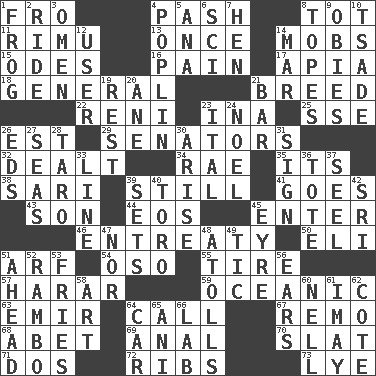 ACROSS 1. From 4. Romantic infatuation 8. Small child 11. Tall New Zealand timber tree 13. At one time in the past 14. Crowds into 15. Lyric poems 16. Ache 17. Capital of Western Samoa 18. Commissioned military rank 21. A special lineage 22. Painter Guido (1575-1642) 23. _ tizzy (2 wds.) 25. Compass dir. 26. Eastern Standard Time (abbr.) 29. Legislators 32. Started a card game 34. Actress Charlotte 35. ___ a Wonderful Life 38. Indian skirt 39. Free of sound 41. Travels 43. Boy, to dad 44. Greek goddess of the dawn 45. Keyboard key 46. Plea 50. Biblical high priest 51. Sandy's bark 54. Bear (Spanish) 55. Become fatigued 57. Ethiopian city, capital of Harari 59. Pertaining to the sea 63. Arab leader 64. Give a ring to 67. San ____ (Riviera town) 68. Collude with 69. Of or related to the anus 70. Narrow board 71. Two (Sp.) 72. Chest bones 73. Potassium hydroxide DOWN 1. Tree-dwelling hopper 2. Travel on or in a vehicle 3. Sign of something about to happen 4. Cotton for raincoats, e.g. 5. Santa ___, CA 6. _-fi 7. Layer 8. Drinks excessively 9. Off-Broadway awards 10. Sadhe (variant) 12. One who makes use of a thing 14. Make imperfect 19. State of inaction 20. A saturated hydrocarbon 21. Long, evenly shaped piece 23. Slanted text style (abbr.) 24. Christmas carol 26. Begley and Asner 27. Oceans 28. Edible starchy tuberous root 30. Get up 31. Public display of a written message 33. Actor's bit 36. Lug 37. Sew up the eyelids of hawks and falcons 39. Arranges properly for use 40. "Corrida" creature 42. Indian title of respect (Mr.) 45. Jane of fiction 47. Not either 48. Ringlike coral islands and reefs 49. Nervous spasm 51. At or in the front 52. Role for Stallone 53. Strips of potato fried in deep fat 56. Hearing organs 58. Nonscientific branch of learning 60. 1994 drama film starring Jodie Foster 61. "If ____ say so..." 62. ____ d'Azur (French Riviera) 64. Auto 65. Black tropical American cuckoo 66. Experiment locale