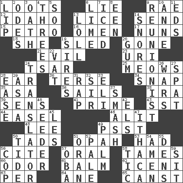 ACROSS 1. Plunders 6. Whopper 9. Actress Charlotte 12. Potato state 13. Louse (plural) 14. Post 15. Stone: prefix 16. Sign of something about to happen 17. Religious women 18. A female animal or person 19. Downhill vehicle 20. Went 21. Morally bad or wrong 23. RI univ. 24. Russian ruler of old 25. Catcalls? 28. Ewer handle 30. Laconic 34. Fastener 35. White ___ sheet 36. Travels by water 38. Lyricist Gershwin 39. Elected reps. 41. A-one 43. Fast jet (abbr.) 44. Artist's stand 46. Set down 48. Area sheltered from the wind 49. Inconspicuous attention getter 50. Bits 51. Brightly colored fish 53. Possessed 56. Quote 57. Of the mouth 58. Softens 60. Aroma 61. Lip ointment 62. Ancient Celtic tribe of eastern Britain 63. For each 64. A saturated hydrocarbon 65. 2nd pers. sing. pres. of can (arch.) DOWN 1. Mouth edge 2. Lyric poems 3. Pledge 4. Triplets 5. "Barney Miller" actor Jack 6. Citrus frut 7. On the rocks 8. Car or cant ending 9. One who advocates reunion 10. Queen of England 1702-14 11. Begley and Asner 13. Hang loosely or laxly 14. Sounds asleep 19. Founders of families 20. Chewing product 22. Large container 24. Interpreter 26. Armed conflicts 27. Petty quarrel 28. Relaxation 29. Toward the sea 31. Hit sharply and swiftly 32. Title for a knight 33. Biblical high priest 37. Box-office sellout 40. Sowing specialist 42. Raised railways 45. French article 47. New York city 49. Inside of hand 50. Event that recurs at intervals 51. Northwest Algerian city 52. Diluted with white 54. So be it 55. Cub Scout units 56. Police officer (slang) 57. Chief or king in Benin or Nigeria 58. Nervous spasm 59. Be seated