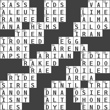 ACROSS 1. Backtalk 5. Music discs 8. Large container 11. Eskimo relative 13. Area sheltered from the wind 14. Citrus frut 15. Indian princess (variant) 16. Compass dir. 17. _ mater 18. Santa ___, CA 19. Folds over and sews together 21. Grain storage towers 22. Adolescent 24. SW Asia republic 25. Pressed 27. Ovum 29. Small pie 30. Sports stadium 32. Domed church section 33. Believer in; advocate of (suffix) 35. Prepare for publication 39. Moved through 41. Do over again 42. Actress Charlotte 43. Bathroom 45. Travel on or in a vehicle 48. Length times width 49. Titles for men of rank and authority 50. International (abbr.) 52. Three (prefix) 55. At once, immediately (arch.) 56. Heredity factor (abbr.) 57. Flexible twig of a willow tree 59. Is not 60. The first octave above the treble staff 61. Give a jingle 62. French article 63. Color 64. Conclusions DOWN 1. "Two Mules for Sister ____" 2. Actor Alda or Thicke 3. Legislators 4. Institute legal proceedings 5. Clement's nick name 6. Habitations of wild animals 7. Observe 8. Country residence 9. ID or VA city 10. Afternoon social gatherings 12. Giggle 14. Den 20. Conclude 21. Omen 23. Keyboard key 25. Call ___ day 26. Hit sharply and swiftly 27. Epoch 28. Commissioned mil. rank 30. Help 31. Nest on high 33. Alias (abbr.) 34. To separate or throw off 36. Accusation by an informer 37. Binary compound 38. Small child 40. Ancient Greek god of war 43. Make lace 44. Lowest deck of a ship 45. Remove soap 46. Removes the wrinkles 47. Undesirable depression on a surface 49. Move on water 50. In an inward manner 51. Nathan's nickname 53. Tear apart 54. Angers 56. June honoree 58. A female animal or person