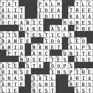 ACROSS 1. Make lace 4. Inside of hand 8. Affectionate concern, for short 11. Came down and settled, as after flight 13. It may be bright or harebrained 14. Relationship diagram 15. French philosopher Descartes 16. Prepare for publication 17. Polynesian shrub of the pepper family 18. Pertaining to the sea 21. Dwellings 22. Libertine 23. White ___ sheet 25. Before (prefix) 26. ___ a Wonderful Life 29. A testis 32. The wife of a rajah (variant) 34. Wedding promise 35. Lion 38. Among 39. French painter Edouard 41. High mountains 43. Parent Teacher Assoc. 44. Curve 45. Join together 46. French bagpipes 50. Compass dir. 51. Adept person 54. R.R. building 55. I made a mistake 57. Remove soap 59. Motivate 63. Pate de foie ____ 64. Move on water 67. Roberta Peters solo 68. Johnson of "Laugh-In" 69. Legendary monster 70. Confederate soldiers (slang) 71. Whopper 72. Egg locale 73. Fast jet (abbr.) DOWN 1. Edible starchy tuberous root 2. Actor Baldwin 3. Prong on a fork 4. Components 5. Say or write further 6. Flowery wreath 7. Floor protector 8. _____ steamer (cargo ship) 9. Crowbar 10. Stop 12. Pull apart 14. Ring climax 19. Nathan's nickname 20. D.D.E's nickname 21. Actor Linden 23. Helper 24. Highlander 26. Lyricist Gershwin 27. Pack (down) 28. In a ____ (agitated or irritated) 30. Tinged 31. Liveliness 33. Dutch treat 36. Writer Wiesel 37. Elects 39. Vertical spar for supporting sails 40. Length times width 42. Observe 45. United States Postal Service (abbr.) 47. Purpose 48. Bathroom 49. A really long time 51. Therefore, facetiously 52. High-altitude cloud 53. Related on the mother's side 56. Practice fight 58. Compass dir. 60. Angers 61. Chest bones 62. 90 degrees 64. Manchild 65. Personal question 66. Big collection agency