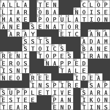 ACROSS 1. Silent film actress Nazimova 5. "___ Little Indians" 8. Hoof sound 12. One who doesn't tell the truth 13. Chief or king in Benin or Nigeria 14. Annoying sound 15. Create 16. Census information 19. One (Scot) 20. Elected representative 21. Like ___ of sunshine 23. And so on (abbr.) 24. Santa ___, CA 27. Fast planes 30. First man 31. Unemotional ones 34. Object of repulsion 35. Painter Guido (1575-1642) 38. Drinks excessively 40. SW Asia republic 41. Greek god of love 42. Slept 44. Is not 45. Falsehood 46. Modern: prefix 47. To sift 50. It may be bright or harebrained 53. Stimulate to action 57. Plant excrement 59. Supplying deficiencies 63. "Two Mules for Sister ____" 64. First name in cosmetics 65. Baking dish 66. Image 67. Lacerate 68. Conclude 69. Canisters DOWN 1. _ mater 2. Climbing, woody, usually tropical vines 3. Member of a famous L.A. basketball team 4. "We ___ not amused" (Victoria) 5. Drink excessively 6. Inky black, to poets 7. California wine valley 8. Small bed 9. Cards in a Roman deck? 10. Bear (Spanish) 11. Fenced enclosure 14. Drug cop 17. Shoshoni 18. Car dealer's back yard 20. System (abbr.) 22. Aid 24. The sixth month of the Jewish calendar 25. Nanny 26. So be it 28. Small child 29. The Jewish people; Israel 30. Remained 32. Accounting whiz (abbr.) 33. Back-to-school mo. 35. It's straight from the horse's mouth 36. Celtic language 37. Words to Nanette 39. Health resort 43. Writer Wiesel 47. Cause heat under the collar 48. Compass dir. 49. Eastern Standard Time (abbr.) 51. 1973 Nobel Price Winner (Physics) Leo 52. Composer Copland 54. Corncob 55. "Terrible" tsar 56. Tear apart 58. Zero-star reviews 59. Put into a specified state 60. Purpose 61. Parent Teacher Association (abbr.) 62. For each 63. Be seated