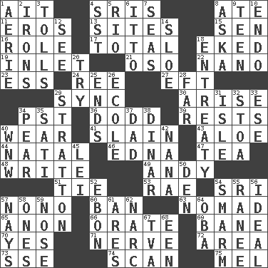 ACROSS 1. Small island 4. Indian titles of respect 8. Had dinner 11. Greek god of love 13. Locates 15. Elected rep. 16. Hero or heavy, e.g. 17. Add up to 18. Supplemented with great effort 19. An arm off of a larger body of water 21. Bear (Spanish) 22. Billionth: prefix 23. Double-curved letter 24. To riddle 27. Lizard (obsolete) 29. Synchronize (abbr.) 30. Originate 34. Pacific Standard Time (abbr.) 36. Texas town _ City 39. Musical pauses 40. Erode 41. Killed 43. _ vera 44. Brizilian seaport 46. Pulitzer Prize-winning author Ferber 47. Afternoon social gathering 48. Compose 49. Actor Griffith 51. Neckwear 53. Actress Charlotte 54. Indian title of respect (Mr.) 57. Words to Nanette 60. Prohibit 63. Roamer 65. At once, immediately (arch.) 66. Speak pompously 69. Object of repulsion 70. It is so 71. Effrontery 72. Type of rug 73. Compass dir. 74. Examine minutely or intensely 75. Cartoonist voice _ Blanc DOWN 1. Nest on high 2. Metal shackles 3. For Whom the Bell _____ 4. Fast jet (abbr.) 5. _ de Janeiro 6. "Tell ____ the Marines!" 7. Oceans 8. "____ silly question..." 9. Adolescent 10. Inside; within (prefix) 12. Observe 14. _ gin 18. Plea 20. Attempt to accomplish something 25. Conclusions 26. Learning spot: Fr. 28. Distant 29. Ski resort town in Vermont 31. Small island 32. Portico 33. Compass dir. 34. Lightbulb-shaped fruit 35. Suttee (variant) 37. Male parent 38. Middle Eastern gold or silver currency 40. Compass dir. 42. Nanny 45. Flowery wreath 50. Lair 52. Inky black, to poets 54. Excessive but superficial compliments 55. Indian princess (variant) 56. Perfect 57. Negative votes 58. Washington bills 59. Characteristic smell of wine 61. Ancient Greek god of war 62. Drug cop 64. Chief or king in Benin or Nigeria 67. Federal power corp. 68. Car or cant ending