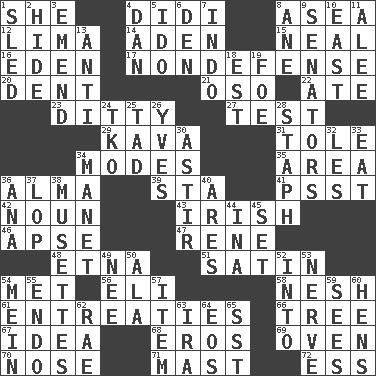 ACROSS 1. A female animal or person 4. "You Light Up My Life" star Conn 8. Toward the sea 12. Pale green bean 14. An important port of Yemen 15. Anneal 16. Locale of original sin 17. Unrelated to defense, as in spending 20. Gouge 21. Bear (Spanish) 22. Had dinner 23. Short, simple song 27. Trial 29. Polynesian shrub of the pepper family 31. Lacquered or enameled metalware 34. Methods 35. Length times width 36. _ mater 39. R.R. building 41. Inconspicuous attention getter 42. Part of speech 43. From or relating to Ireland 46. Domed church section 47. French philosopher Descartes 48. Inactive volcano in Sicily 51. Smooth fabric 54. Was introduced to 56. Biblical high priest 58. Tender 61. Pleas 66. Family _ (genealogy) 67. The main thing one is thinking about 68. Greek god of love 69. Baking chamber 70. Characteristic smell of wine 71. Vertical spar for supporting sails 72. Double-curved letter DOWN 1. Downhill vehicle 2. Flintstone garb 3. Make improvements or corrections to 4. Daniel's nick name 5. Wedding promise 6. Lair 7. Southeast Asian peninsula 8. A saturated hydrocarbon 9. Elected representatives 10. 90 degrees 11. Toward shelter 13. Opposed to 18. Eastern Standard Time (abbr.) 19. Enemy 24. Ring climax 25. Bit 26. Jacques Cousteau's middle name 28. Staphylococcus 30. Moving about 32. French article 33. Erode 34. French painter Edouard 36. Santa ___, CA 37. Trim (branches) 38. French bagpipes 40. Ancient Greek god of war 44. _ tizzy (2 wds.) 45. Put into a specified state 49. Born 50. Insect wing 52. To the inside or interior of 53. Boldness 54. Count _ (2 wds.) 55. Inside; within (prefix) 57. A distinct part 59. Observes 60. Coop moms 62. Actress Charlotte 63. Lyricist Gershwin 64. Greek goddess of the dawn 65. Fast jet (abbr.)