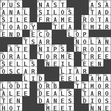 ACROSS 1. Product of festering 4. Political cartoonist Thomas 8. White ___ sheet 11. Of or related to the anus 13. Grain storage towers 15. Small amount or degree 16. Filth; sediment 17. Movie unit 18. Round or rotation of duties 19. Sycophant 21. Beverage made from leaves 22. Arab leader 23. Conclude 24. Environmental prefix 27. Trim (branches) 29. Russian ruler of old 30. Pitcher Ryan 34. Had dinner 36. Pinches, bites 39. Wear away 40. Taken by mouth 41. Singer Mel 43. Woody plant 44. Exchanges for money 46. Famous astronaut Armstrong 47. Car or cant ending 48. Witty Wilde 49. One who doesn't tell the truth 51. Hat (slang) 53. Snakelike fish 54. Nursemaid (var.) 57. Farming town in central California 60. Globe 63. Southeast Indonesia island 65. Toward shelter 66. Allots cards 69. Pacific island yam 70. Nine, plus one 71. Natives or inhabitants of Denmark 72. "Vaya con ____" 73. Being at a high temperature 74. Rendezvous 75. Compass dir. DOWN 1. Thick mixture 2. The state of being joined or united 3. First course 4. Overdraft (abbr.) 5. Atmosphere 6. Narrow board 7. Heavy book 8. Smallest unit of an element 9. Suttee (variant) 10. The sixth month of the Jewish calendar 12. Directed 14. Lick closed 18. Newsperson 20. Affirmative reply 25. Patter 26. Constellation of myth 28. Single 29. Copy Pinocchio 31. Old wives' tales, e.g. 32. An important port of Yemen 33. Born 34. Ancient Greek god of war 35. Baby powder 37. Before (prefix) 38. Grin 40. Bear (Spanish) 42. Writer Wiesel 45. Indian title of respect (Mr.) 50. The first octave above the treble staff 52. Texas town _ City 54. With great haste 55. Person of subnormal intelligence 56. Came up 57. Thin strip of wood or metal 58. Margarine 59. Undesirable depression on a surface 61. 480, 500 or 516 sheets of paper 62. Object of repulsion 64. It would 67. Area sheltered from the wind 68. Fast jet (abbr.)