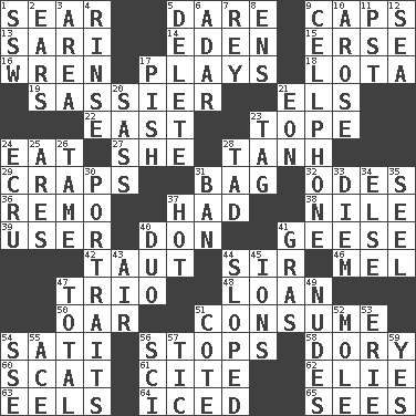 ACROSS 1. Shrivel 5. Have the gumption 9. Smile enhancers 13. Indian skirt 14. Genesis locale 15. Celtic language 16. Songbird 17. Live dramatic performances 18. Globular water bottle used in Asia 19. More lively and spirited 21. Raised railways 22. Compass direction 23. Drink excessively 24. Ingest 27. A female animal or person 28. Hyperbolic tangent 29. Dice game 31. Paper or plastic container 32. Lyric poems 36. San ____ (Riviera town) 37. Possessed 38. "Death on the ____" 39. One who makes use of a thing 40. Spanish title 41. Honkers 42. Strained 44. Title for a knight 46. Cartoonist voice _ Blanc 47. Musical group of three 48. Grant temporary use of 50. Rowing implement 51. Ingest 54. Suttee (variant) 56. Constricts 58. Small, narrow, flatbottom fishing boat 60. Scram, to a cat 61. Quote 62. Writer Wiesel 63. Snakelike fish 64. On the rocks 65. Perceives with the eye DOWN 1. Compass dir. 2. Hearing organs 3. Type of rug 4. Remove soap 5. Keyboard key 6. The sixth month of the Jewish calendar 7. Marina Del _, California 8. Followers of ems 9. Portable communications device 10. Came up 11. Pacific Standard Time (abbr.) 12. Ocean 17. Expression of disdain 20. Backtalk 21. Period of immesurable duration 23. Label 24. Shade of tan 25. Ancient Greek god of war 26. Docile 28. Small amount or degree 30. Likenesses of persons 31. Bar 33. South Vietnam president (1954) 34. Otherwise 35. Stitch closed the eyes of (a falcon) 37. Being at a high temperature 40. Superhero pair 41. Pate de foie ____ 43. Atmosphere 44. Had an oblique or slanted direction 45. Charged particles 47. "_____ Recall" 49. Unadorned figures 51. ____ d'Azur (French Riviera) 52. Undercover agent 53. One of the Great Lakes 54. Compass dir. 55. Adept person 56. _-fi 57. Nervous spasm 59. Consenting reply