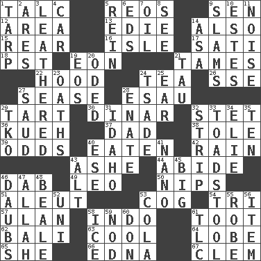 ACROSS 1. Baby powder 5. Vintage cars 9. Elected rep. 12. Type of rug 13. Singer Brickell 14. In addition 15. Posterior 16. Capri or Wight 17. Suttee (variant) 18. Pacific Standard Time (abbr.) 19. Period of immesurable duration 21. Makes less strong or intense 22. Parka part 24. Beverage made from leaves 26. Compass dir. 27. Gospel singer Marvin 28. Son of Isaac 29. Small pie 30. Middle Eastern gold or silver currency 32. Proofreading order 36. Malaysian steamed pastry 37. June honoree 38. Lacquered or enameled metalware 39. Likelihood 40. Consumed 42. Water falling in drops from the sky 43. American tennis player Robert 44. Remain 46. Pat or tap gently 49. Lion 50. Cuts off 51. Native American of Southwest Alaska 53. Gear tooth 54. Three (prefix) 57. Uhlan (variant) 58. _ china 61. A blast of a horn 62. Indonesian resort city 63. Calm and collected 64. Ear part 65. A female animal or person 66. Pulitzer Prize-winning author Ferber 67. Clement's nick name DOWN 1. Canvas cover 2. Ancient Greek god of war 3. Resembling or made to resemble leather 4. Auto 5. It's straight from the horse's mouth 6. Begley and Asner 7. Lubricate 8. Observe 9. Shuts with force 10. _____ Park, CO 11. Annoying sound 14. White ___ sheet 19. Greek goddess of the dawn 20. Wrote a lyric poem 21. The 19th letter of the Greek alphabet 23. Expletives 24. Sadhe (variant) 25. Hearing organ 27. Saudi Arabian king (1953-1964) 28. Related on the mother's side 29. Ring climax 31. Potato state 32. Long narrow piece of something 33. Inedible or poisonous agaric 34. Writer Wiesel 35. "___ Little Indians" 40. Compass dir. 41. Billionth: prefix 43. Keyboard modifier key 45. Large 46. Applies to a surface 47. Assad's deity 48. Memphis, Tenn. Street 52. Corn or form start 53. Root beer relative 55. Loose flowing garment 56. A whole individual unit 58. Frozen water 59. Lower and raise head in agreement 60. Spanish title 61. Affectionate concern, for short