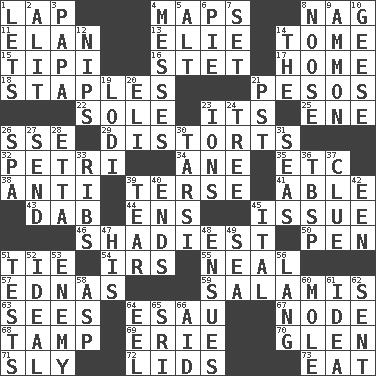 ACROSS 1. Pet locale 4. Atlas contents 8. Tired old horse 11. Liveliness 13. Writer Wiesel 14. Heavy book 15. Native american tent (variation) 16. Proofreading order 17. Dwelling 18. Paper fasteners 21. Mexican monetary units 22. Not divided or shared with others 23. ___ a Wonderful Life 25. Compass dir. 26. Compass dir. 29. What propaganda does 32. _ dish (used to culture cells) 34. A saturated hydrocarbon 35. And so on (abbr.) 38. Opposed to 39. Laconic 41. Competent 43. Small moist lump or mass 44. Followers of ems 45. Come out of 46. Most dubious of character or honesty 50. Animal enclosure 51. Make a knot 54. Big collection agency 55. Anneal 57. Ferber et al. 59. Deli grouping 63. Perceives with the eye 64. Son of Isaac 67. Thickened enlargement 68. Pack (down) 69. One of the Great Lakes 70. Small, secluded valley 71. Playfully artful 72. Hats (slang) 73. Erode DOWN 1. Allows 2. Set down 3. Dad 4. Makes clutter 5. The first octave above the treble staff 6. Sliced dessert 7. Arrange properly for use 8. Trap for birds or small mammals 9. ID or VA city 10. Honkers 12. Cuts off 14. Definite Article 19. Farming town in central California 20. Connecticut Ivy Leaguer 21. Pacific Standard Time (abbr.) 23. Charged atoms 24. Relationship diagram 26. Health resort 27. Post 28. Singer James 30. Tarsus (plural) 31. Oceans 33. Chest bones 36. Cook's measure (abbr.) 37. A slight indication 39. Lacerate 40. Extremities 42. Car or cant ending 45. Slanted text style (abbr.) 47. Part of HMS, perhaps 48. Follows as a consequence or result 49. Ocean 51. Trials 52. Standard of perfection 53. Foe 56. Austrian-born American filmmaker Fritz 58. Viper 60. Undercover agent 61. It may be bright or harebrained 62. Transmitted 64. Snakelike fish 65. _ Lanka 66. Help