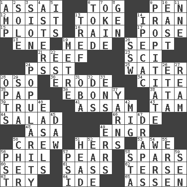 ACROSS 1. Slender Brazilian palm 6. Coat; cloak 9. Animal enclosure 12. Damp 13. Casino tip 14. SW Asia republic 15. Graphs 16. Water falling in drops from the sky 17. Introduce or present, as a question 18. Compass dir. 19. Ancient Persian 20. Back-to-school mo. 21. Coral collection 23. _-fi 24. Inconspicuous attention getter 25. Wetness 28. Bear (Spanish) 30. Wear away 34. Quote 35. Infant food 36. Dark wood 38. "One Day ___ Time" 39. Loyal 41. Indian state 43. Scottish cap 44. First course 46. Travel on or in a vehicle 48. White ___ sheet 49. Engineer (abbr.) 50. Ship's personnel 51. Possessive pronoun 53. Deep reverence 56. Silvers or Donahue 57. Lightbulb-shaped fruit 58. Practice fights 60. Puts into a specified state 61. Backtalk 62. Laconic 63. Attempt 64. Binary compound 65. NE Netherlands city DOWN 1. Electrical Unit 2. Not divided or shared with others 3. The Jewish people; Israel 4. Michaelmas daisies 5. ___ a Wonderful Life 6. Frog relative 7. Migrant worker of the '30s 8. Commissioned mil. rank 9. Conciliate 10. 90 degrees 11. Compass dir. 13. Unclean, religiously 14. Medicinal drug used to evoke vomiting 19. Distance measurement (Brit.) 20. Compass dir. 22. Compass dir. 24. Teen's desire 26. Singer James 27. 480, 500 or 516 sheets of paper 28. Chooses 29. "Two Mules for Sister ____" 31. Chief or king in Benin or Nigeria 32. Two (Sp.) 33. Followers of ems 37. Tall tales 40. Artist's stands 42. Russian fighter aircraft 45. Obsolete 47. Window treatments 49. Blunders 50. "Mermaids" star 51. Froth on beer 52. Comfort 54. Armed conflicts 55. Celtic language 56. Pacific Standard Time (abbr.) 57. Air pressure measure (abbr.) 58. R.R. building 59. Elected rep.