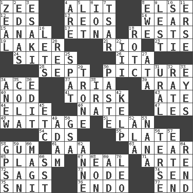 ACROSS 1. Last letter of the English alphabet 4. Set down 8. Otherwise 12. Begley and Asner 13. Vintage cars 14. Erode 15. Of or related to the anus 17. Inactive volcano in Sicily 18. Musical pauses 19. Member of a famous L.A. basketball team 21. _ de Janeiro 23. Make a knot 24. Settings 26. Call ___ day 28. Back-to-school mo. 30. Photo 34. Adept person 37. Operatic vocal solo 39. Like ___ of sunshine 40. Dreamland 41. Cod relative 43. Had dinner 44. Writer Wiesel 46. Nathan's nickname 47. French article 48. Electrical Measurement 51. Enthusiasm 54. Music discs 55. Food holder 58. Chewing product 61. American Automobile Association (abbr.) 63. Approach 65. Suffix with ecto or cyto 67. Anneal 71. Johnson of "Laugh-In" 72. Settles 73. Connecting point 74. Elected rep. 75. In a ____ (agitated or irritated) 76. Inside; within (prefix) 77. Conclusion DOWN 1. Ardor 2. Ferber et al. 3. 1973 Nobel Price Winner (Physics) Leo 4. "We ___ not amused" (Victoria) 5. Allow 6. Electrically charged atom 7. Russian ruler of old 8. She-sheep 9. For fear that 10. Suttee (variant) 11. Celtic language 16. Allows 18. College mil. group 20. Portuguese money of account (variant) 22. One more than two 25. Argument over a trivial matter 27. "One Day ___ Time" 29. Marketplace scale 30. Thick mixture 31. Mountain range 32. Pace 33. Snake ____ (dice throw) 34. Afresh 35. Root beer relative 36. Prepare for publication 38. Retirement account (abbr.) 42. Seaweed 45. And so on (abbr.) 49. First of billions? 50. Girls' org. (abbr.) 52. Wing 53. Nanny 56. Laconic 57. Consumed 58. Global Positioning Systems (abbr.) 59. ____ Bator 60. Wise men 62. Singer Murray 64. Tear apart 66. Fast jet (abbr.) 68. A really long time 69. Say or write further 70. Lion