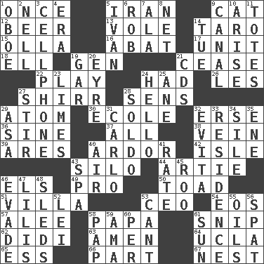 ACROSS 1. Single time 5. SW Asia republic 9. Feline 12. Fermented drink made from hops 13. Short-tailed, large-bodied rat 14. Pacific island yam 15. Spanish pot 16. Blind as ____ 17. A single undivided whole 18. Pipe bend 19. Commissioned mil. rank 21. Desist 22. Live dramatic performance 24. Possessed 26. French article 27. Bake eggs in their shells 28. Elected reps. 29. Tiny particle 30. Learning spot: Fr. 32. Celtic language 36. Trig term 37. Everything 38. Distinctive style or manner 39. Ancient Greek god of war 40. Zeal 42. Small island 43. Grain storage tower 44. Nick name for Arthur 46. Raised railways 49. Adept person 50. Frog relative 51. Country residence 53. Corporate head (abbr.) 54. Greek goddess of the dawn 57. Toward shelter 58. Dad 61. Clip 62. "You Light Up My Life" star Conn 63. So be it 64. Southern CA. univ. 65. Curvy letter 66. Component 67. A home for chicks DOWN 1. Mitch Miller's instrument 2. 1994 drama film starring Jodie Foster 3. Portable communications device 4. Epoch 5. _ the terrible 6. Director Reiner 7. In the manner of 8. Remaining after all deductions 9. Lessep's creation 10. Ascend 11. Hauls 14. Third day of the wk. 19. Slender fish 20. Jane of fiction 21. Music discs 23. Citrus fruits 24. Phone greeting 25. A saturated hydrocarbon 27. Disorderly outburst 28. Twentieth part of a lira 29. White ___ sheet 31. Monte _, Las Vegas Hotel/Casino 32. Webber/Rice musical 33. Dwelling 34. Drop; flow; fall 35. Compass dir. 40. Wind 41. Assign a rank or rating to 43. Health resort 45. Friend of Pooh 46. Elude 47. Ms. Damita and namesakes 48. Bobsleighs 52. Luau accessory 53. Patter 55. Petroleums 56. Petty quarrel 58. Infant food 59. Housemaid (var.) 60. For each 61. Player for Phoenix