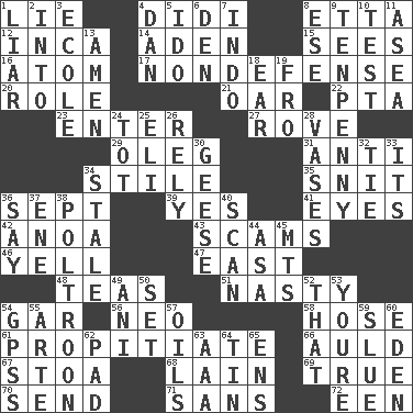 ACROSS 1. Whopper 4. "You Light Up My Life" star Conn 8. Singer James 12. South American Indian 14. An important port of Yemen 15. Perceives with the eye 16. Smallest unit of an element 17. Unrelated to defense, as in spending 20. Hero or heavy, e.g. 21. Boat paddle 22. Parent Teacher Assoc. 23. Keyboard key 27. Be footloose 29. Cassini of fashion 31. Against 34. Vertical member of a panel or frame 35. In a ____ (agitated or irritated) 36. Back-to-school mo. 39. Affirmative reply 41. Snake ____ (dice throw) 42. Small Philippine buffalo 43. Fraudulent business schemes 46. Shout 47. 90 degrees 48. Afternoon social gatherings 51. Difficult 54. Slender fish 56. Modern: prefix 58. Flexible conduit 61. Conciliate 66. Old (Scot.) 67. Portico 68. (Had) reclined 69. Loyal 70. Post 71. Without 72. Car or cant ending DOWN 1. One who doesn't tell the truth 2. To the inside or interior of 3. Learning spot: Fr. 4. Daniel's nick name 5. Wedding promise 6. Lair 7. _ china 8. Compass dir. 9. 3-inch nail 10. Trial 11. Toward the sea 13. So be it 18. Hearing organ 19. From 24. Small child 25. Connecticut Ivy Leaguer 26. Have confidence or faith in 28. Flower holders 30. Honkers 32. Make a knot 33. ___ a Wonderful Life 34. Showing deterioration from age 36. Declare 37. Compass dir. 38. Coward 40. Skim 44. White ___ sheet 45. Mountains (abbr.) 49. Black tropical American cuckoo 50. Put into a specified state 52. Not this but _ 53. You are 54. Global Positioning Systems (abbr.) 55. Johnson of "Laugh-In" 57. Lubricates 59. Turn sharply 60. Paradise 62. Groovy apt. 63. Auto club (abbr.) 64. Metal container 65. Followers of ems